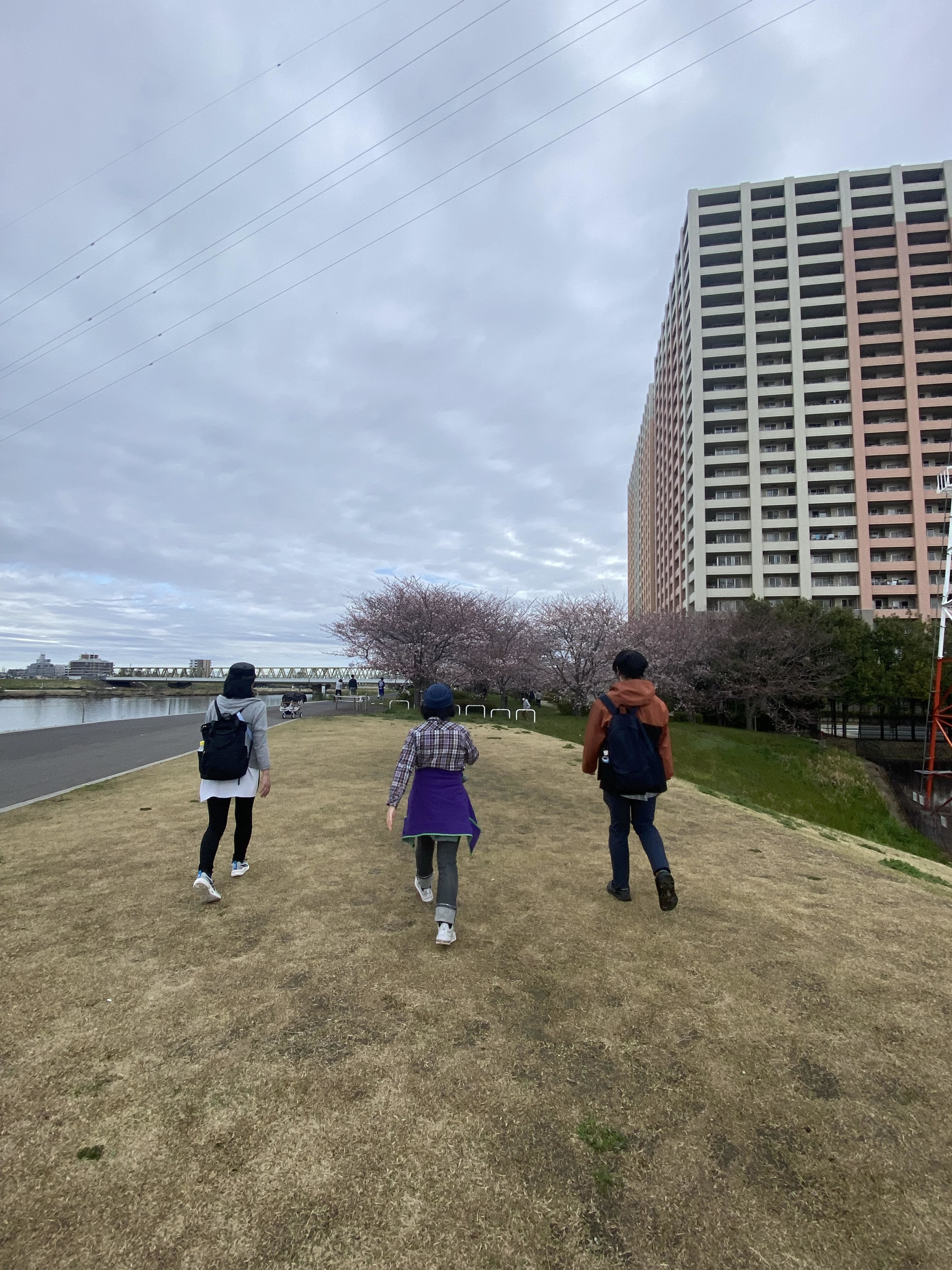 江戸川まで歩いて、桜堤公園横で”ウォーキングの効用についての講義”