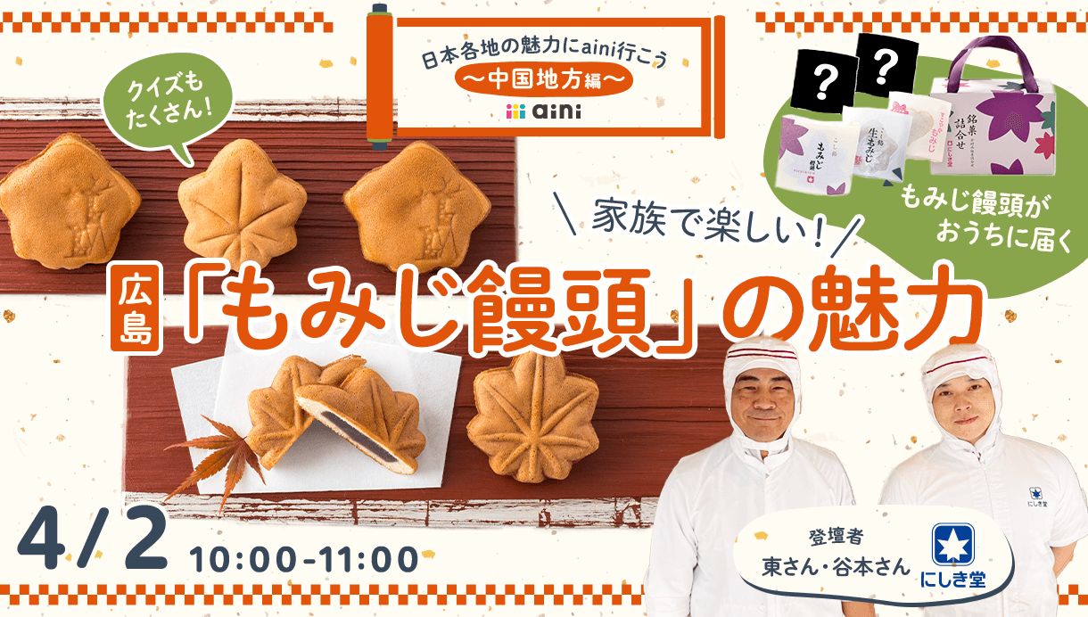 広島に来られた方なら一度は聞いたことがある「もみじ饅頭」。伝統的な広島のお菓子ですが、年々進化が止まりません!和菓子の枠を超えたチョコレートやチーズクリームなど色々な味が登場しています。今回はみなさんにお届けするお饅頭を食べていただきながら、クイズや質問を行う体験型のイベントにしたいと思っています。ぜひお気軽に参加してくださいね♪