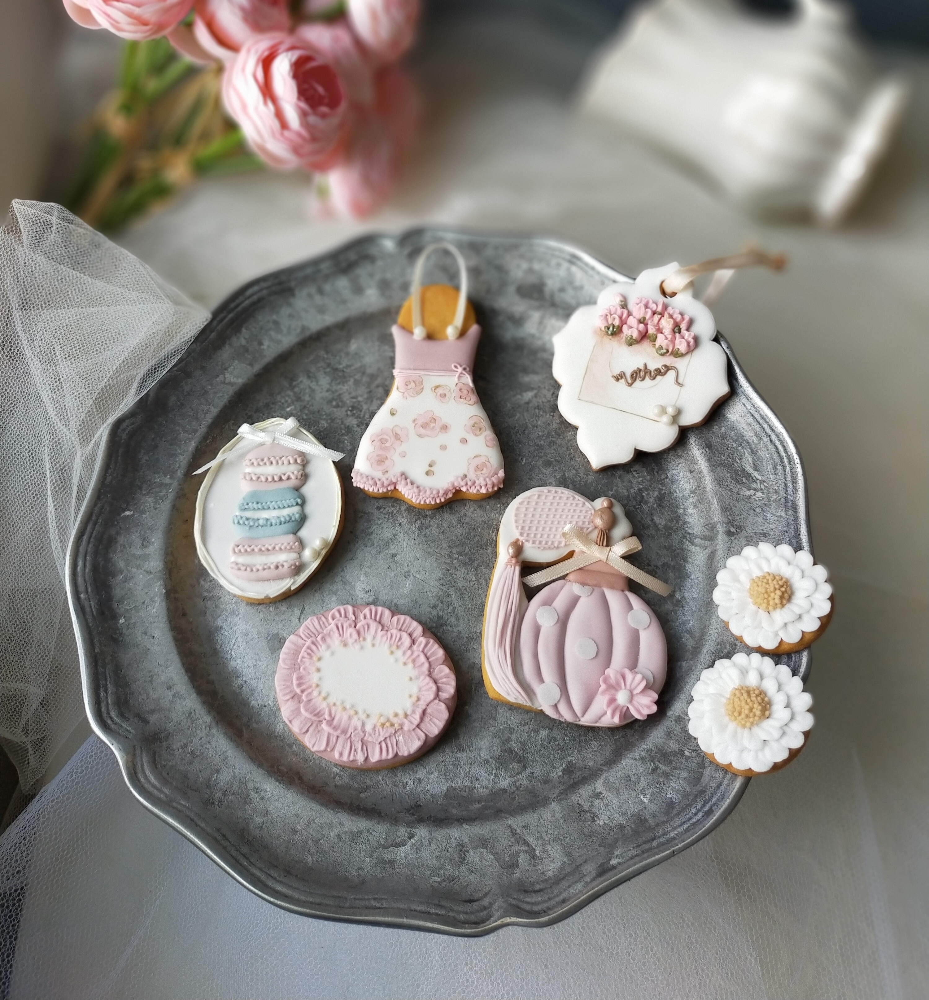 【学べること】・アイシングクリームできれいなラインを引くこと・アイシングクリームできれいに仕上げる方法・ドット柄・エプロンの花柄模様・3Dマカロンの作り方・3Dカーネーションクッキーの作り方(文字は、自由に変更可)・香水アトマイザーの作り方・オーバル型フラワークッキー・マーガレットの作り方(2枚)計7枚のクッキーが作成できます。※クッキー、香水アトマイザーのお花は、講師事前準備とします。