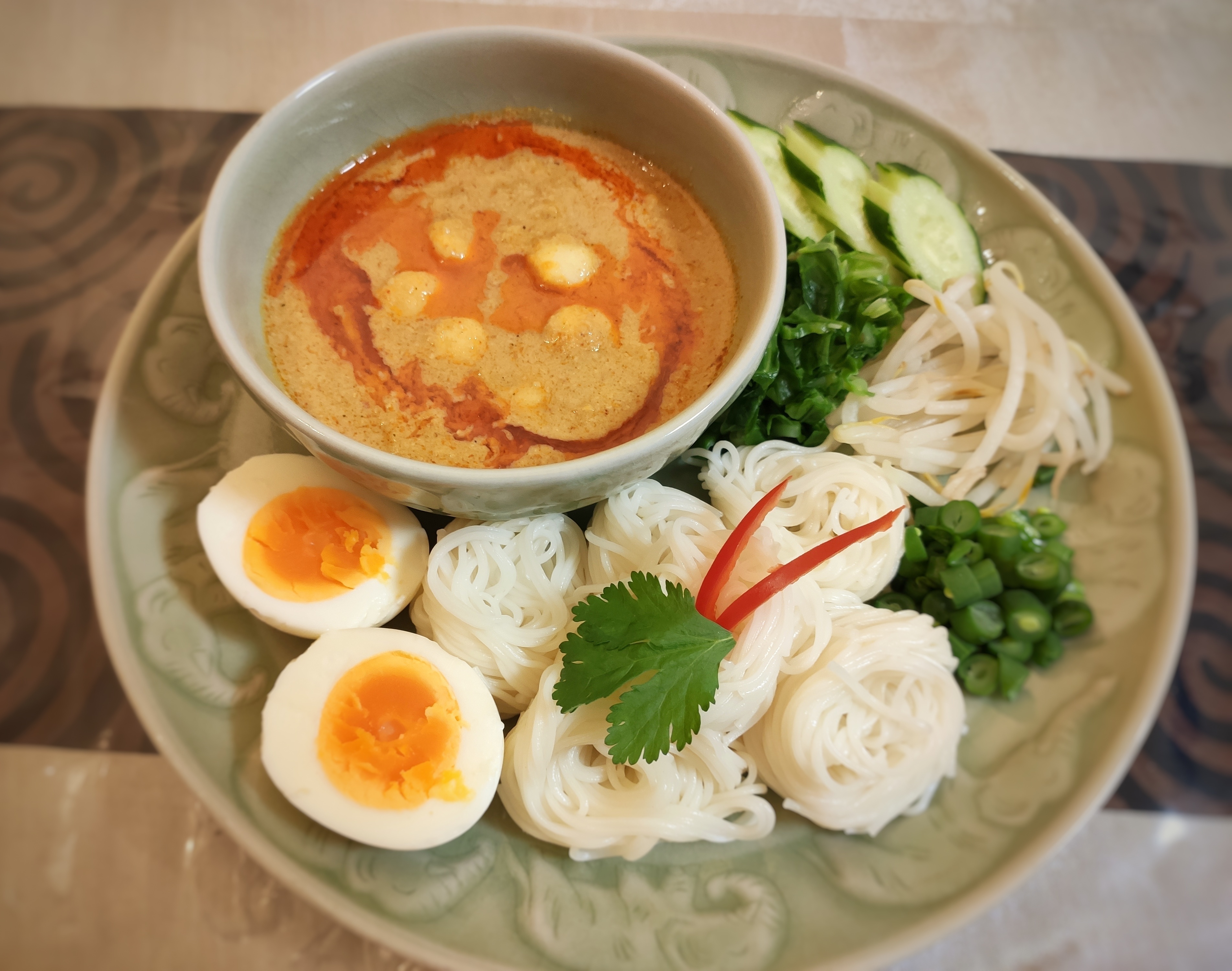 タイのカノムチンは米で出来た生麺のことですが、日本ではそうめんで代用します。