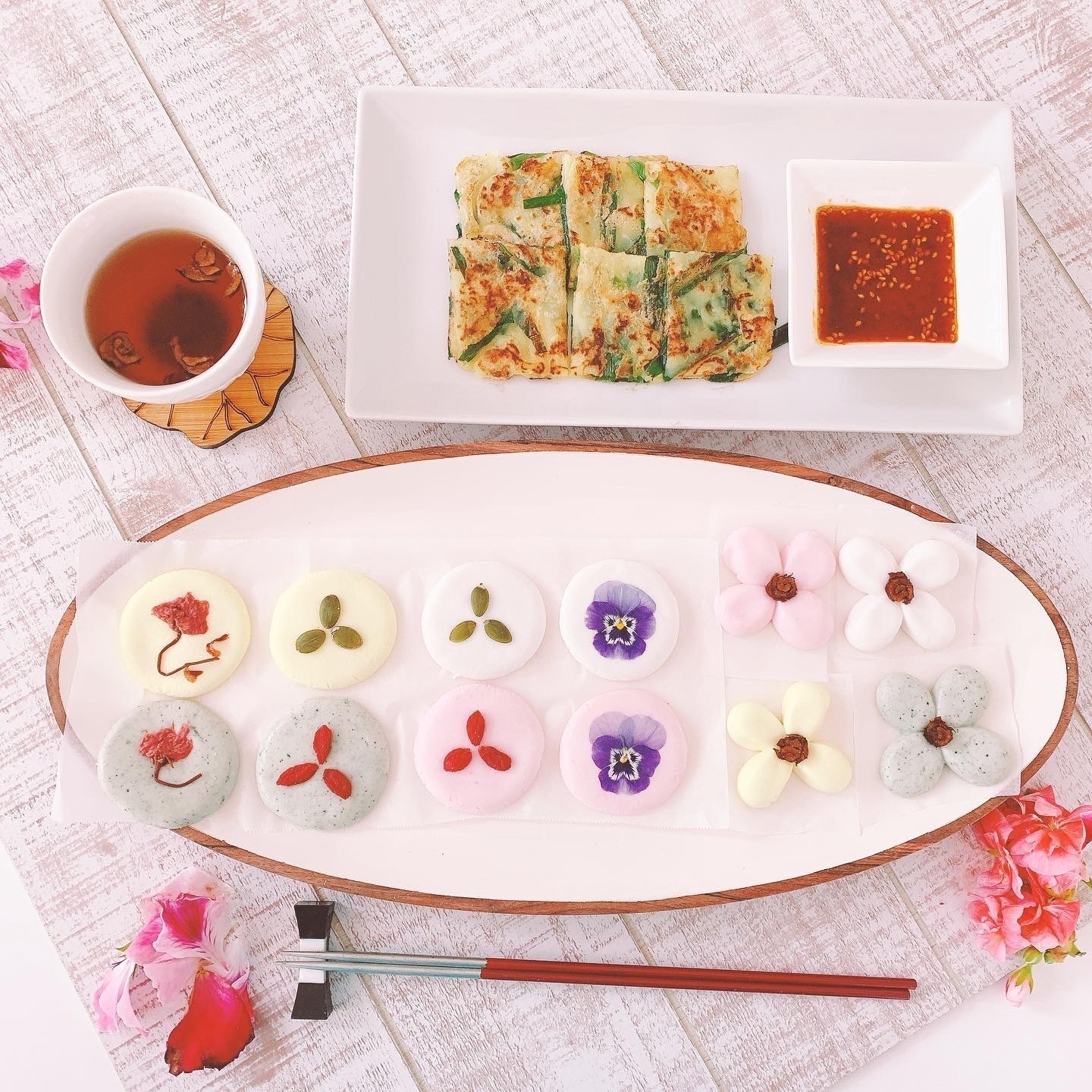 ・【グルテンフリー】花餅 とチヂミと韓国茶