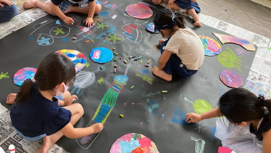 夏をテーマに絵の具、クレヨン等を使い黒い紙にみんなでアートを作っていきます。