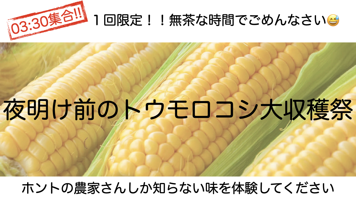 僕たちの体験に関心を持ってくださってありがとうございます!そして無茶な集合時間、申し訳ありません😅でも夜明け前じゃないと本当に美味しいトウモロコシは食べられないんです!トウモロコシは日が落ちると栄養を実に蓄え、日が上がるとため込んだ栄養を実から放出する性質があるんですって。だから本当に美味しいトウモロコシを食べるためには夜明け前に収穫しないといけないんです😮そして日の出が04:30なので集合はギリギリ03:30とさせていただきました!ホントごめんなさい、、😅その代わり収穫したばかりのトウモロコシを蒸して味わっていただきます♪それからコーン茶とコーンフィリングのサンドウィッチもご用意します😄【体験できること】・夜明け前のトウモロコシの収穫・蒸したてトウモロコシの味見(お一人一本ずつ)・コーン茶とコーンフィリングのサンドウィッチ*コミュニティーカフェおうちのご協力をいただきます。*未就学児は料金をいただかない代わりにお食事やお土産はございません。【体験料金に含まれるもの】・トウモロコシの収穫体験・トウモロコシのお土産・夏野菜のお土産(ナスとオクラ)【当日のスケジュール】03:30 集合(スプラポ屋上/松田町松田惣領321-1) ご挨拶、自己紹介の後、トウモロコシ畑に移動します。03:45 収穫スタート 農家の佐野さんから収穫の方法を教えてもらったら、 好きなだけ収穫をしてくだい😄04:15 収穫作業終了 収穫したトウモロコシから3本を選んでください! お土産としてお持ち帰りいただけます。04:30 スプラポ移動 コーン茶を飲みながら屋上から日の出を待ちましょう😄 朝食用にトウモロコシを蒸し始めます♪ スプラポ屋上は天気が良ければ富士が一望できるとても気持ちの良い場所です♪05:00 蒸したトウモロコシを一緒に味わいましょう! コーンフィリングのサンドウィッチもご用意しています。(蒸しトウモロコシがもっと食べたい方はおっしゃって下さい)06:00 解散実は集合場所の松田町はとても交通の便が良いところです。しかも早朝で車も少ないです。近くの川で遊ぶも良し、箱根や富士に行くもよし。伊豆海で遊ぶも良し。目一杯夏休み最初の日曜日を楽しんで下さい♪・やどりき清流マス釣り場(15分くらい/オープン8時😅) →めっちゃ綺麗な清流です。川遊び、釣り、食事、BBQも楽しめます^^ https://helloaini.com/notes/13285?prcd=w5dAG・丹沢湖でSAP(25分)・大磯ロングビーチ(30分)・箱根(40分くらい)・御殿場アウトレット(40分くらい/オープン10時😅)・富士サファリパーク(1時間)・富士山・忍野八海(1時間くらい/https://yamanakako.info/8lakes_top.php)・熱海(1時間くらい)・伊豆下田(2時間くらい)【持ち物、服装】・動き易く汚れても良い服装・懐中電灯(携帯電話のライトも可)・軍手や農作業用の手袋・長靴もしくは汚れてもいい靴【アクセス】集合場所:スプラポ(神奈川県松田町松田惣領321-1)https://goo.gl/maps/xpLW4zhmRKgzhcNn6