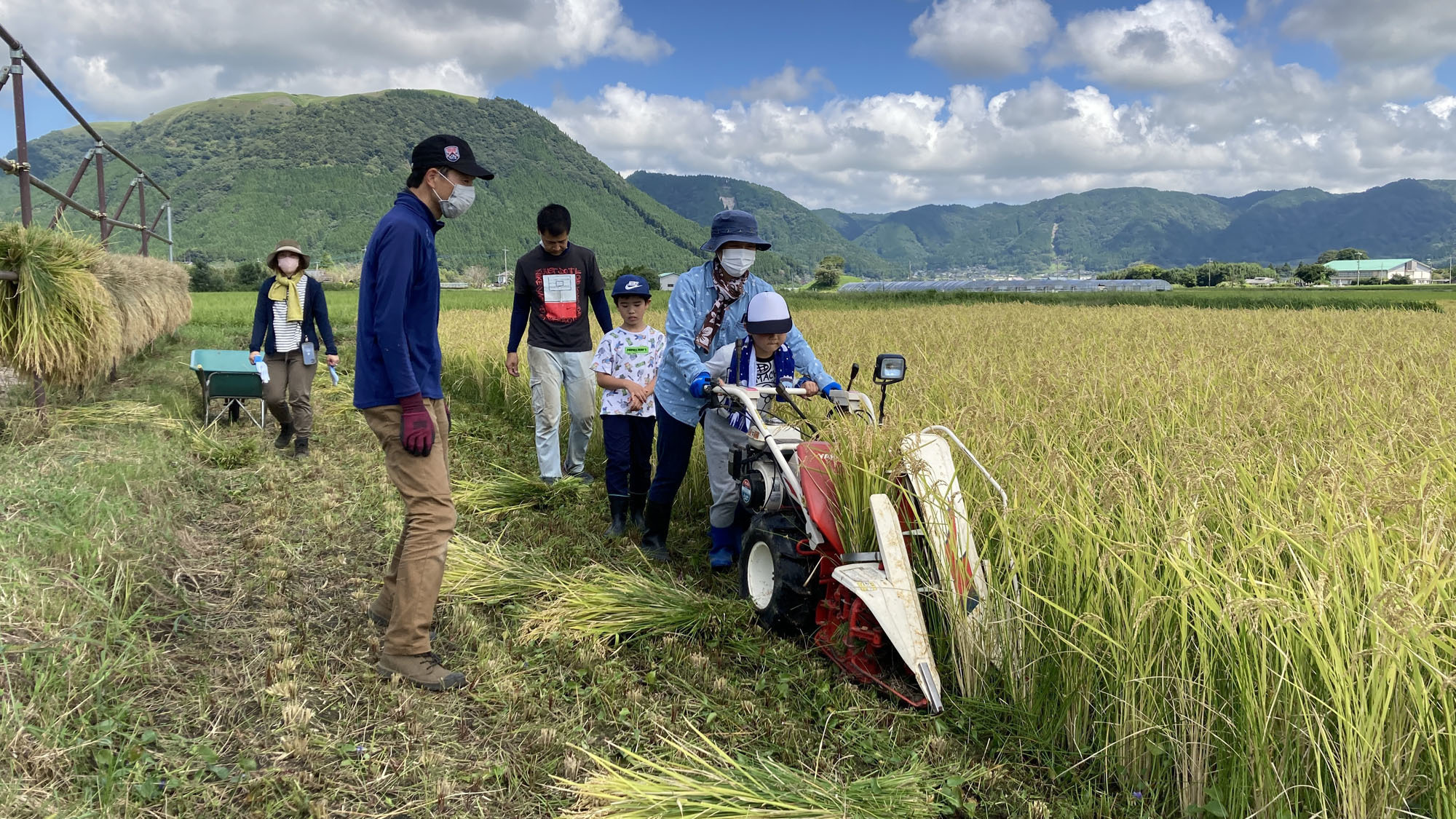 最初は鎌を使った手刈りを体験して頂きますが、後でバインダーという刈り取ってから紐で結んでくれる機械も体験していただく事もできます。