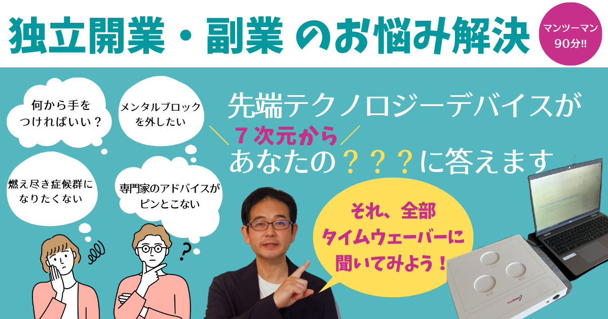 こちらでは、その手法を用いて、これから独立・開業、副業を始める方、キャリアアップを図りたい会社員、フリーランスの方を中心に、タイムウェーバーという潜在意識にアプローチできる機器を活用したお悩み解決!のお手伝いをしていきます。