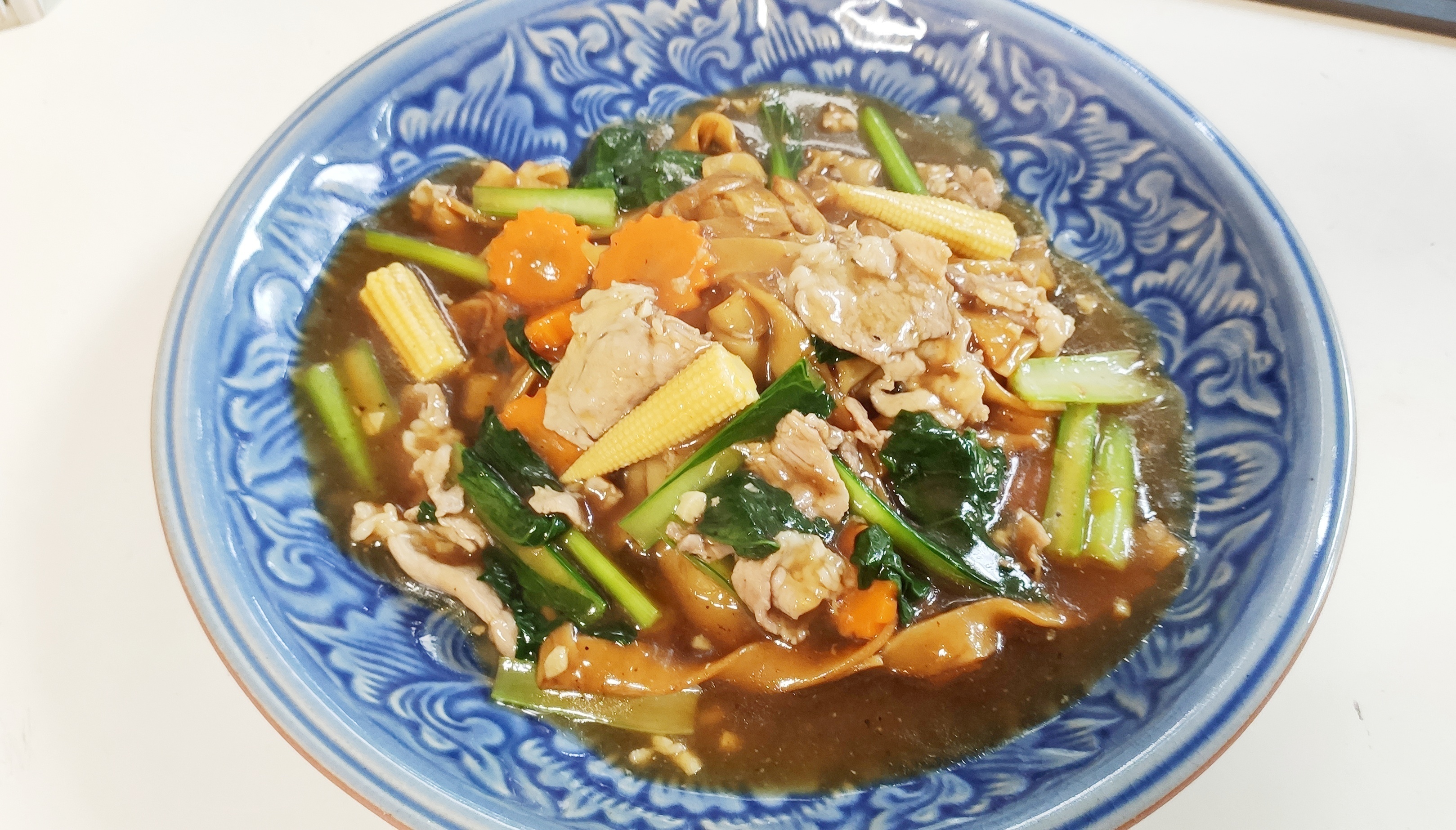ラードナーはタイでは人気な麺料理のひとつです。麺はセンヤイ(太麺)、センミー(ビーフン)そしてミーグローブ(揚げた中華麺)がありますが、今回は2種類のレシピを用意しています。海老入りのかた焼きそば(ミーグローブ)と豚肉入りの太麺やき(センヤイ)です。レッスンで作る時はお好みでどちらかをお選びください。