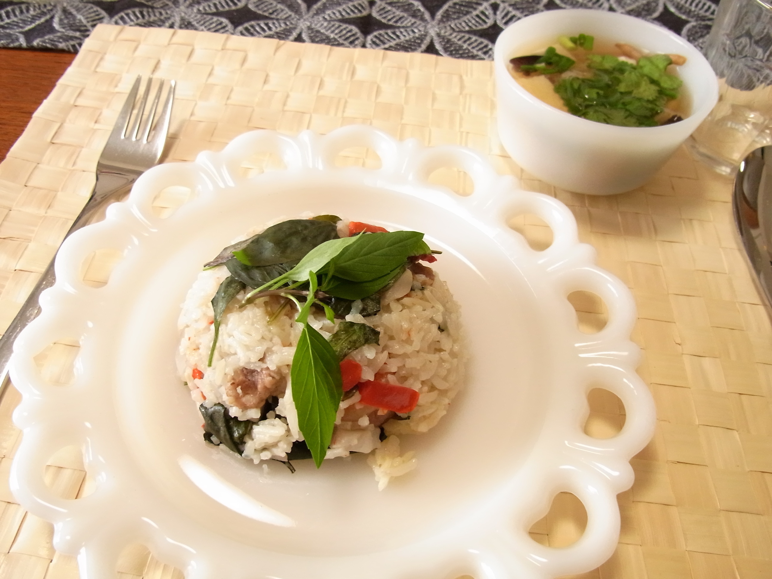秋の厳選 ほっこりタイ料理3品を作る体験です。お鍋1つで作れる、タイのサトイモ炊き込み御飯、体の芯から温まる豆腐スープ、レモングラスたっぷりのフライドチキンです。