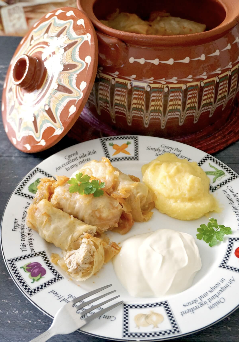 ルーマニアのロールキャベツ、サルマーレにハーブを加えてトマトベースで煮込み、サワークリームをかけて頂きます。
