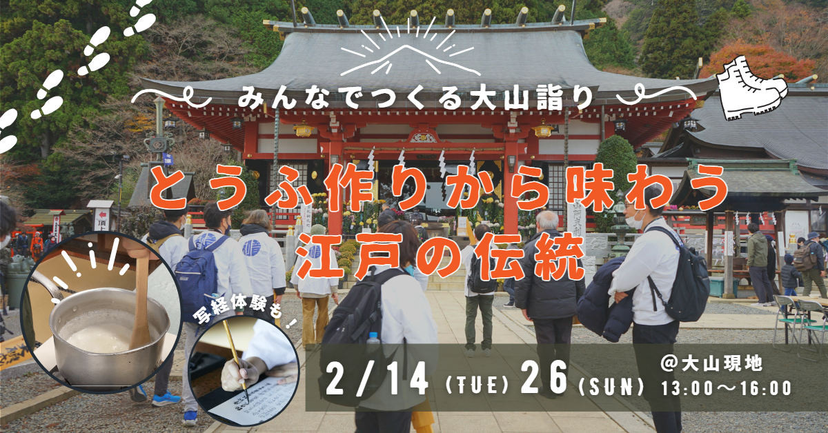 江戸の人口が100万人だった江戸時代中期、「大山詣り」には毎年20万もの人々が訪れたと言われており一大ブームを起こしました。そのお詣りと併せて有名になっていったのが、大山から溢れ出る名水を使用して作った「大山とうふ」です!有名になった理由としては色々あるそうですが、「大山詣りの際にお世話になった宿坊(定宿)への謝礼品の一部として大豆が贈られることが多かったこと」「参詣者に提供する大量の食事を保存しておく設備などがないため、 井戸水などにつけて保存できるとうふが最適だったこと」「とうふの製造と保存に適した大山の良質な水が使われたこと」、「とうふが修験者や僧職経験者が食べ慣れた精進料理であったこと」などが言われています。この様に多くの要因が存在することから、「大山の名物=とうふ」となっていった可能性があります。今回は、大山参道沿いに佇む400年の歴史を持つ宿坊「東学坊」を舞台に、神奈川県随一の大山名水を使った「大山とうふ」作りを体験し、食べることで、大山を5感で感じていただきます。とうふ作り体験後は、令和の大山詣り(大山での新たな過ごし方)のアイデアを皆さんで出し合えたらと思います。とうふ作り体験の他に、東学坊先導師によるお祓いと心を落ち着かせる写経も併せて体験いただけます。★「大山詣り」についての詳細は、大山ふたたびサイト、日本遺産ポータルサイトをご確認ください。大山ふたたびサイト https://www.odakyu.jp/oyama/concept/日本遺産ポータルサイト https://japan-heritage.bunka.go.jp/ja/special/meguri/isehara/【当日スケジュール】13:00 主催者挨拶(13:00までに東学坊に集合ください。)13:05 参加者自己紹介13:10 とうふ作り体験①13:20 写経体験13:50 とうふ作り体験②14:50 試食ととうふ販売製造事業者からの創作とうふ作り紹介15:00 新たな大山詣りを考えるディスカッション16:00 解散〇体験ホスト東学坊第15代目先導師 相原 理人昨年の2月より地域の事業者と連携し、大山で唯一の天然温泉の一般提供を開始。温泉以外にも、とうふ作りや写経体験を取り入れ、「これまでの大山、大山詣りをベースに様々なコンテンツを組み合わせて、大山詣りの魅力を多くの方に知ってもらいたい」という思いのもと大山の活性化を図っています。〇交通費は各自ご負担をお願い致します。【ご案内】大山ケーブルカー乗車や神奈中バス(指定区間)を複数回乗車される方にお得な丹沢・大山フリーパスのご紹介・小田急線(本厚木~渋沢)、バス指定区間、大山ケーブルカー(Aきっぷのみ)が乗り降り自由・大山参道や周辺の優待、割引・小田急線(発駅~本厚木・渋沢)往復割引きっぷ詳しくは下記URLをご確認ください。https://www.odakyu-freepass.jp/tanzawa/