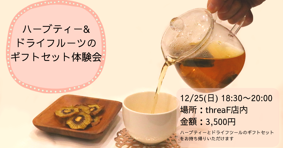当日は、ハーブティーとドライフツールを2~3種類ずつご試食いただき、お気に入りの商品を1つずつギフトセットとしてプレゼントさせていただきます!