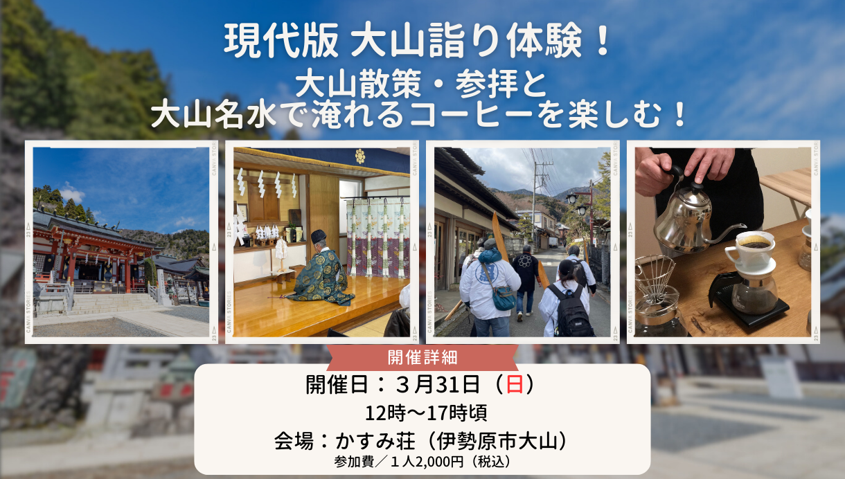 この体験は、大山の宿坊「かすみ荘」で大山の名水で淹れるコーヒーの実飲や美味しいコーヒーの淹れ方などのレクチャーと大山詣り(先導師によるお祓いと大山阿夫利神社下社への散策・参拝)がセットになった現代版の「新たな大山詣り」体験となります。