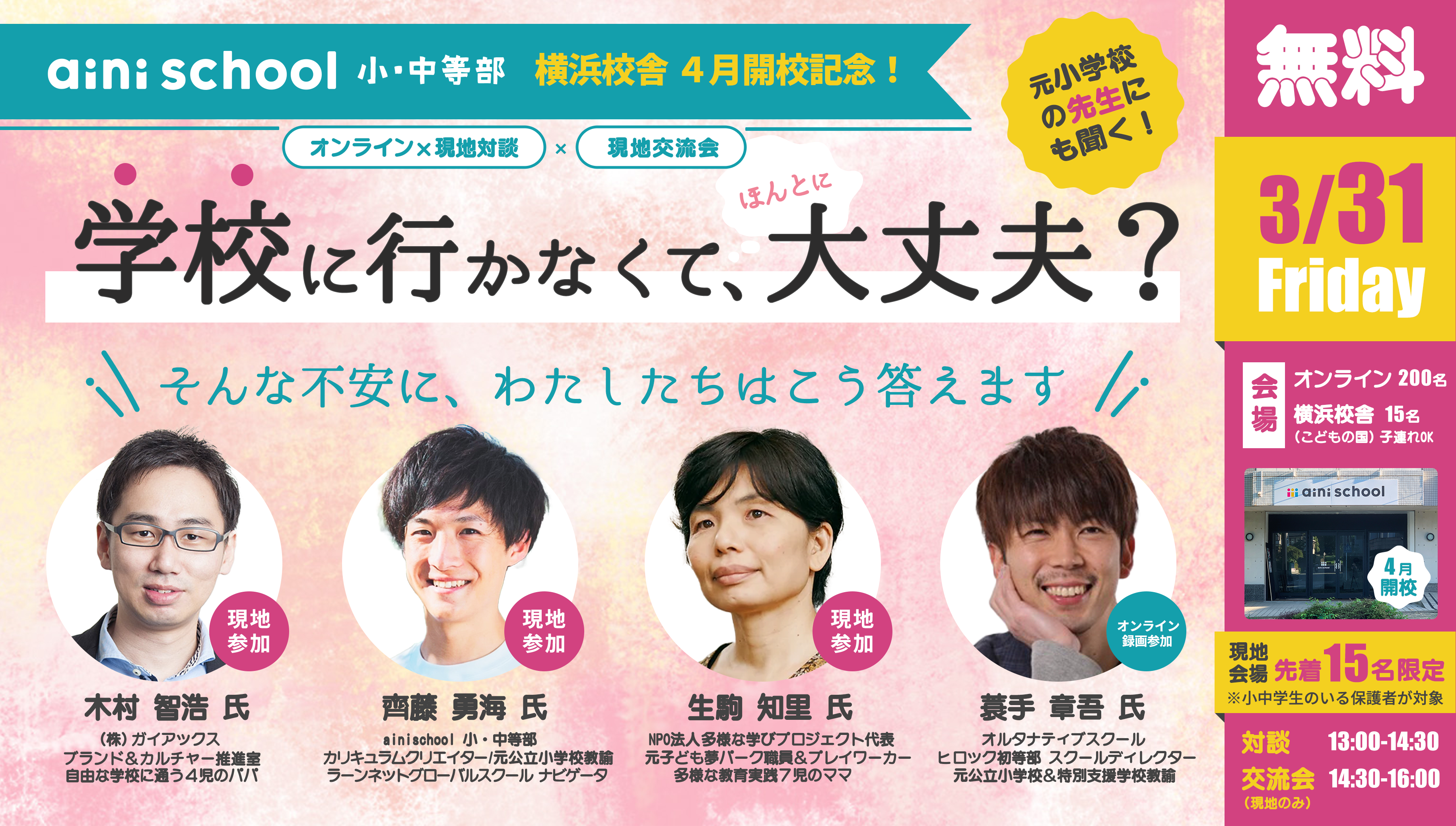 ▼【概要】横浜校舎4月開校記念!保護者向け対談イベント「学校に行かなくて、大丈夫?」・対象:<校舎会場>小中学生のいる保護者 ※お子様同伴OK<オンライン会場> どなたでも・参加費:無料・日程:3/31(金)・時間: 13時~16時 (開場 12:50〜)・対談者:木村 智浩 氏、齊藤 勇海 氏、生駒 知里 氏(現地参加)、蓑手 章吾 氏(オンライン録画参加)▼当日スケジュール:12:50-開場13:00-14:30 対談&質問タイム14:30-16:00 交流会(現地のみ)▼お申し込みの流れ以下のフォームに必要事項を記載し送信ください。その後、参加に必要な詳細のご案内をメールでお送りいたします。お会いできますこと楽しみにしております! https://share.hsforms.com/1HZKaAZ8QS2-t3l9sIEX3nge8zrq※こちらの体験ページからは予約はできません。必ず上記フォームよりご予約ください。