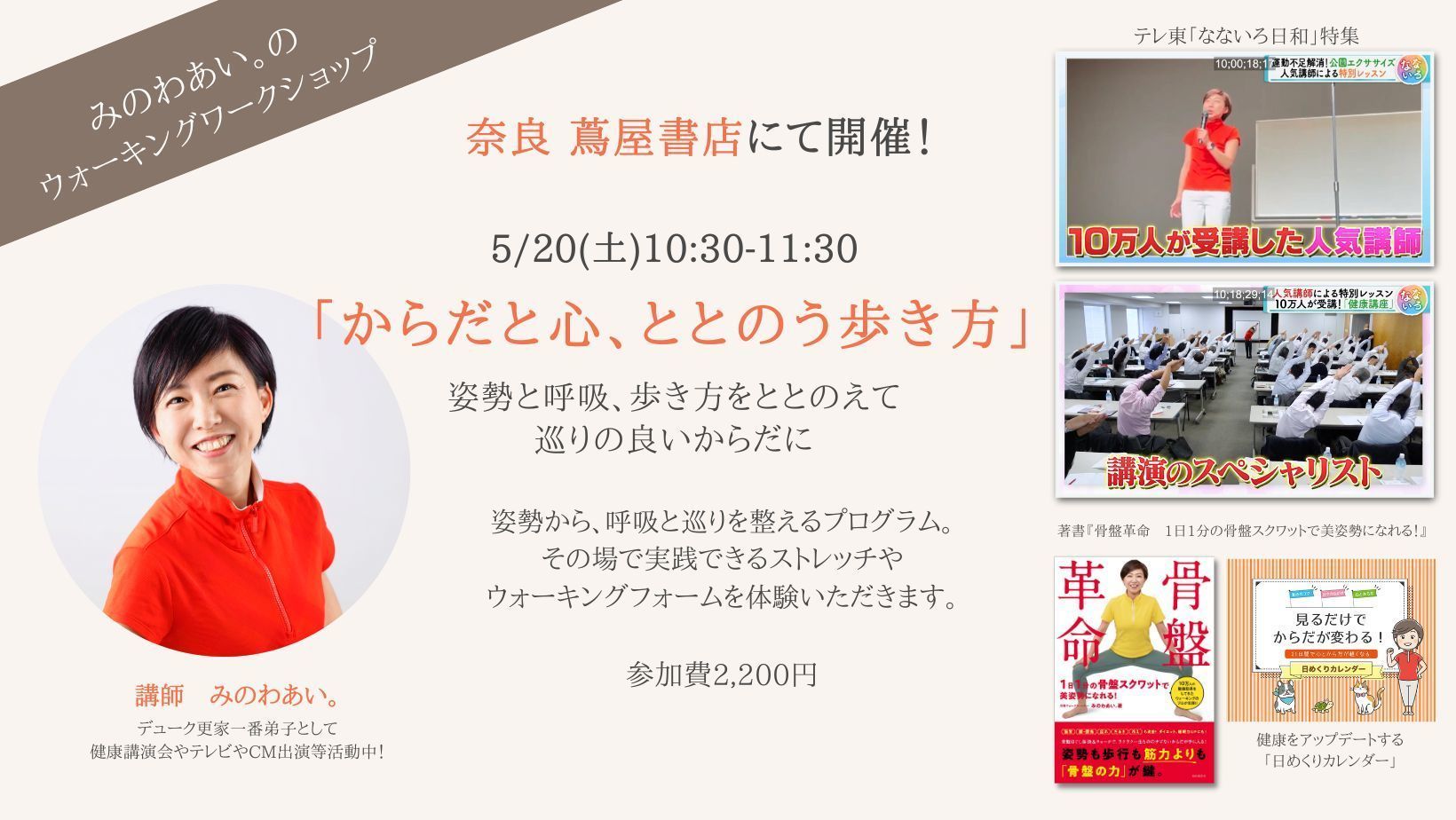 5/20(土)奈良 蔦屋書店でみのわあい。ウォーキングワークショップ「からだと心、ととのう歩き方」を開催します!姿勢と呼吸、歩き方をととのえて巡りのよいからだにからだを動かせば心が元気になります!私たちの健康は、日常生活の中にあります。普段の呼吸や、姿勢、歩き方から見直して、1日300歩からはじめる心身の健康づくりのコツをお持ち帰り下さい。運動不足をなんとかしたい方や体力に自信がない方も安心してご参加いただけます。https://youtube.com/shorts/gaXw5RopOAo?feature=share<プログラム>姿勢から、呼吸と巡りを整えるプログラムです。その場で実践できるストレッチやウォーキングフォームを体験いただきます。※カジュアルな服装、普段着でご参加いただけます。(スニーカー等、フラットシューズ推奨)奈良 蔦屋書店HPhttps://store.tsite.jp/nara/event/shop/32858-1643110405.html講師みのわあい。プロフィール大阪出身、奈良在住。 立命館大学産業社会学部卒業。 20代でウォーキング指導の第一人者である デューク更家氏に弟子入り。 心身の健康について学び、ウォーキング理論を習得。 その後、健康経営・健康意識啓発・安全意識啓発の分野で、多くの企業や自治体の健康講 演会で登壇し、これまでの受講者は10万人超。実際にからだを動かすだけでなく「健康クイズ」や「若さチェック」などの参加型の要素 に加え、楽しんで笑いが起きる仕掛けを盛り込んだ「参加型! 健康エンターテインメント 講演会」として好評を得ている。骨から意識して動かすとからだが変わるオリジナルメソッドでは、日常動作の姿勢や歩き方呼吸を整えることで、からだの巡りをよくして様々なからだの不調、お悩みに対応するレッスンを展開している。また、義足の方への歩き方指導として「義足ウォーキングレッスンプログラム」を提供している。https://youtube.com/playlist?list=PLY7MbhglAhsKnzqZnYZRUo-IL6Vc_q9YRテレビ、ラジオ等のメディア出演多数。大正製薬リポビタンDXαほか、CM出演中。 著書に『骨盤革命 1日1分の骨盤スクワットで美姿勢になれる』『健康をアップデートする日めくりカレンダー』がある。LINE公式アカウントで、1日1分レッスン動画を配信。https://lin.ee/UEZP7DAYouTubeチャンネル https://www.youtube.com/user/love970/