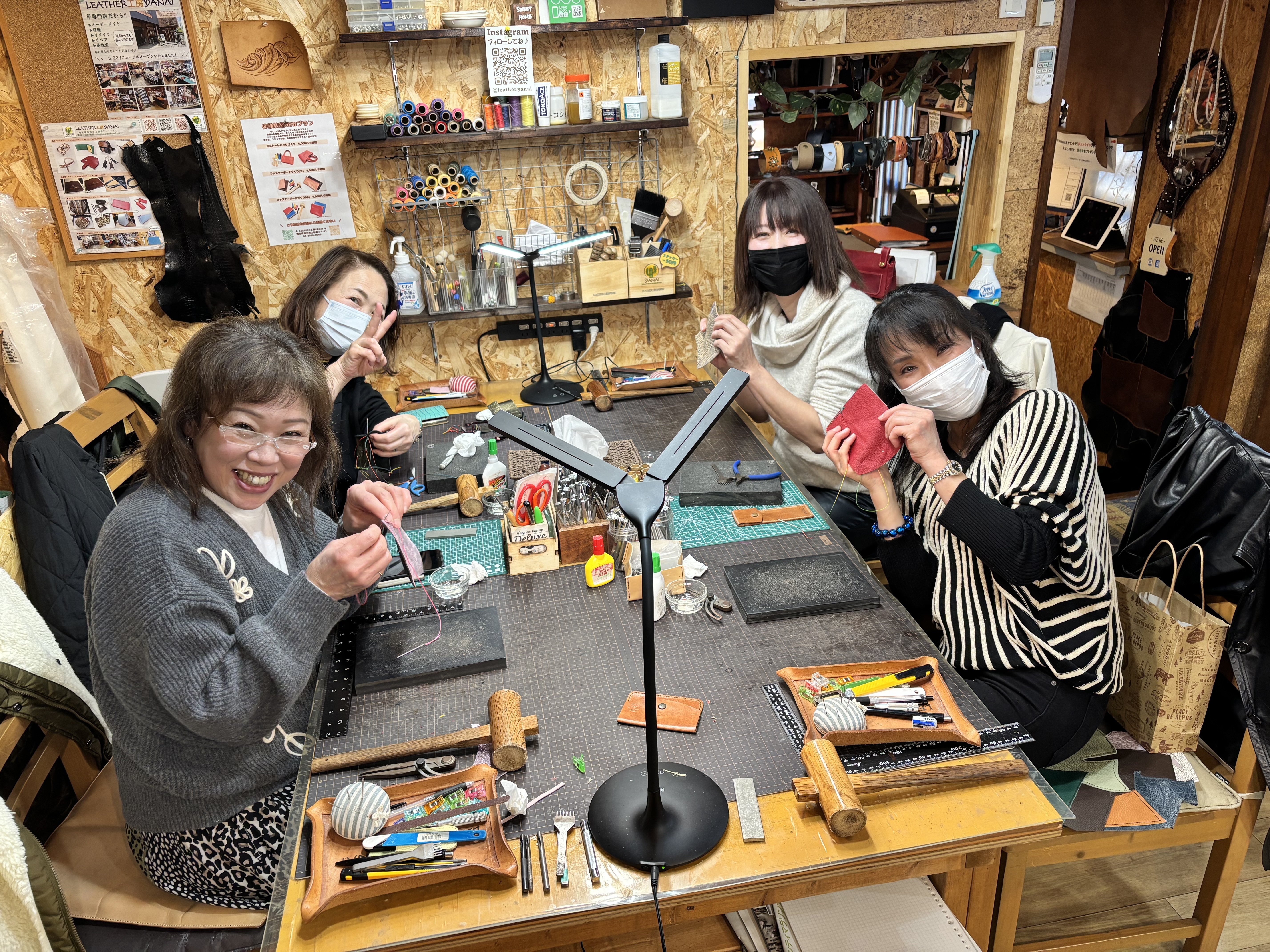 体験教室では、コインケース・カードケース・ペンケースの3種類から選べます!まるで「今日の運勢占い」みたいに直感で選んでください。革の色、ホックの色、ステッチの色も自由自在!自分好みのカラフルな作品を作れます。もう「どれにしようかな」で迷う時間も楽しい!