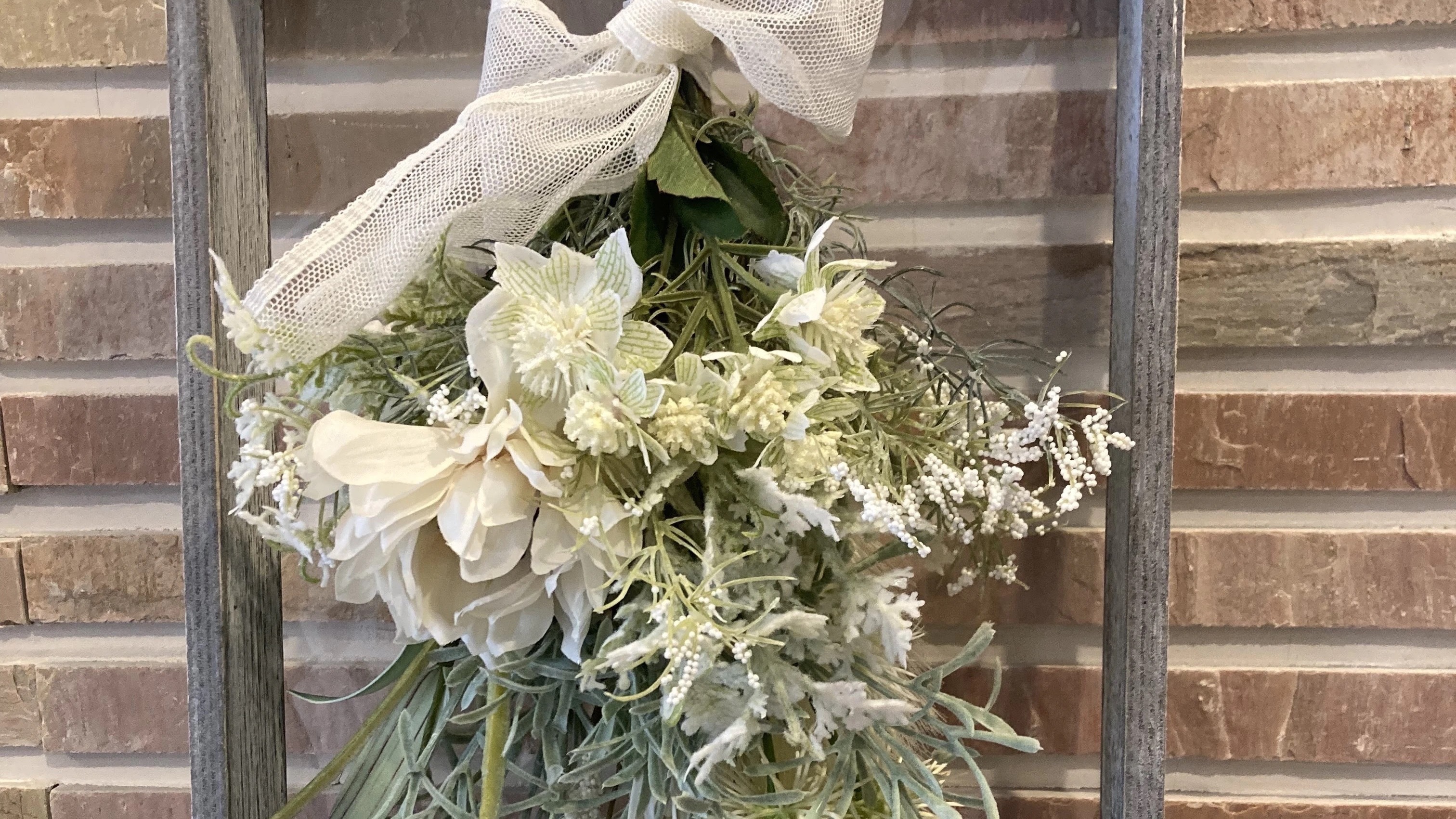夏に映える色々なニュアンスのホワイトとグリーンを束ねたスワッグリースのレッスンです。