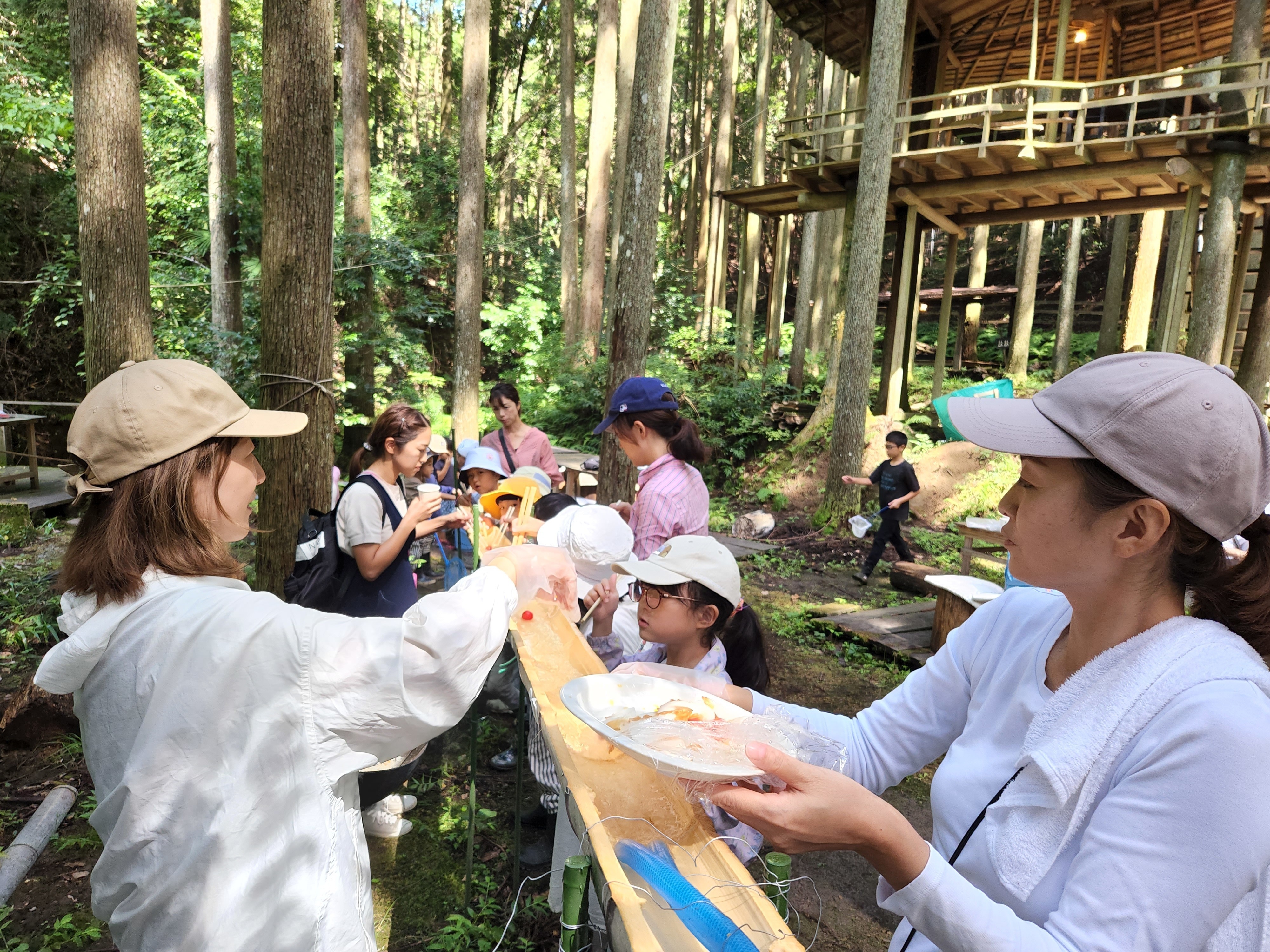 夏の体験として行う「森の流しソーメン」は、山からみんなで竹を切り出し、ソーメンが流れるように竹のレーンに仕上げたり、お椀、箸づくりも手づくりで行うという本格的な自然の中での流しソーメンです。流れるものは、ソーメンのほか、何が流れるかは、お楽しみに!