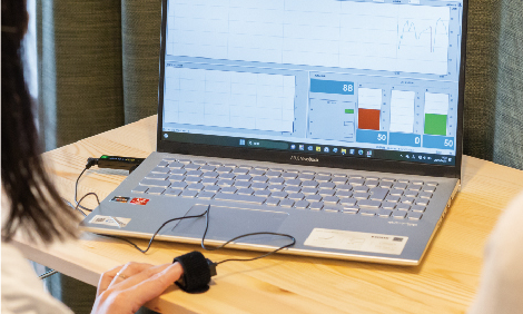 指先や耳たぶに測定器を着けて、心臓の拍動の揺らぎ(心拍変動)を測定します。