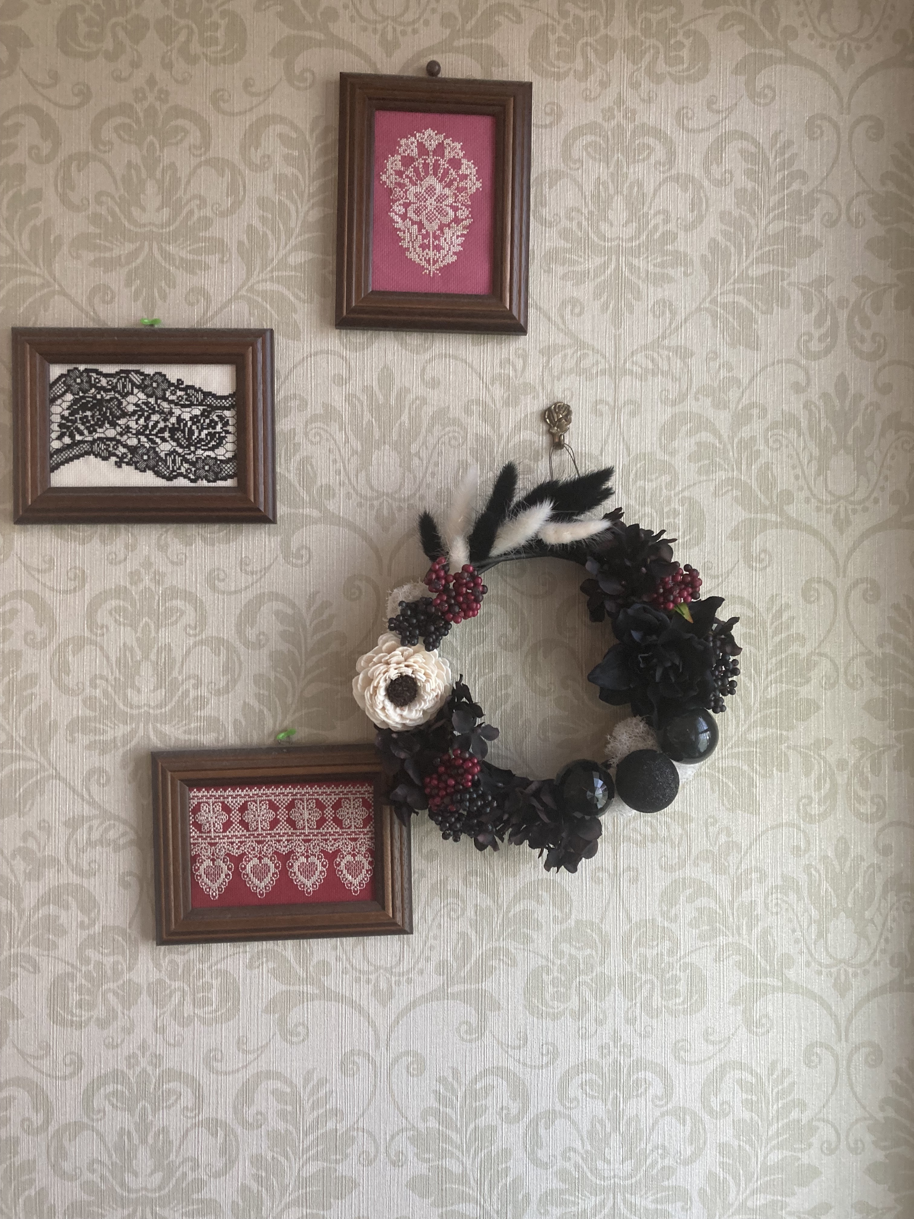今回はゴシックスタイルを意識したモノクロカラーにアクセントカラーに赤を効かせたリースです。