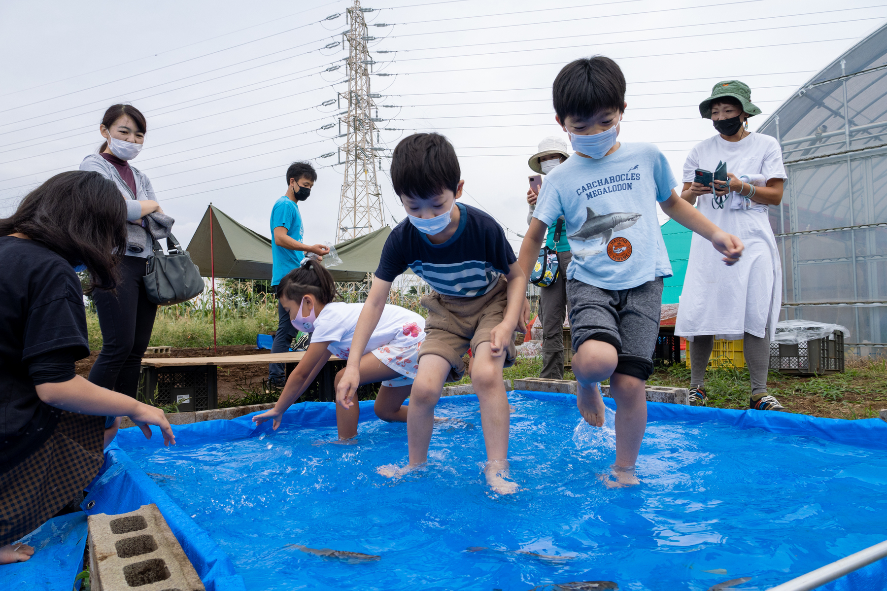 さあ、いよいよ本日のメインイベント! 畑に作った簡易プールに、山北町から運ばれた元気なヤマメを投入します。