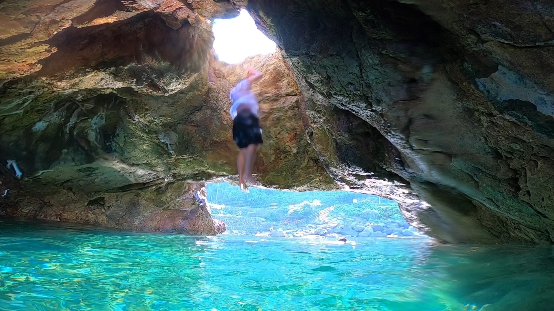 最後は、穴の空いた場所から洞窟に向かって飛び込みしましょう!
