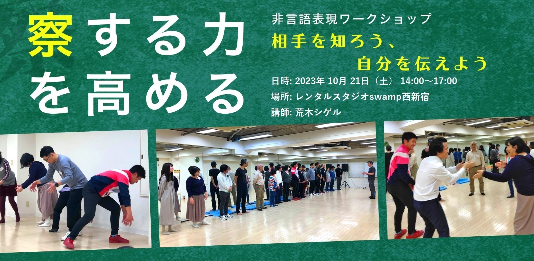 舞台やCGアニメーション、企業研修など幅広く活動するコミュニケーション・トレーナー、荒木シゲルによる非言語コミュニケーションのワークショップを開催します。