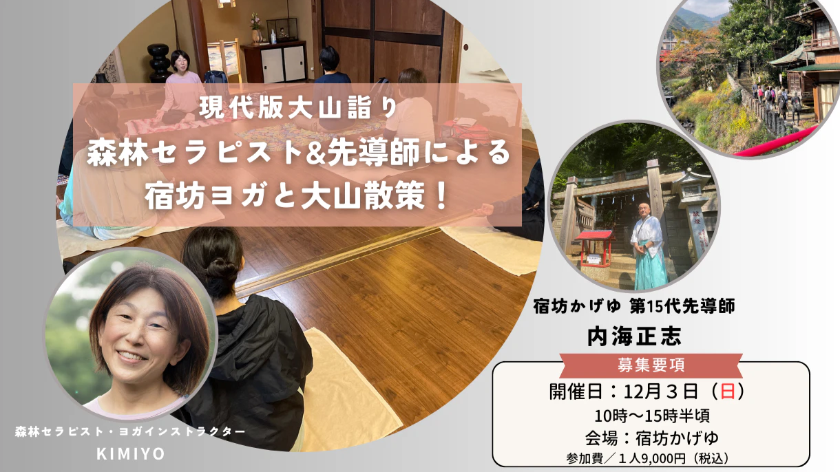 この体験は、伊勢原市大山の豊かな自然や歴史の魅力を感じながら、「江戸時代から続く宿坊でのヨガセッション」、「宿坊の先導師によるお祓いと口上」、「標高約700メートルに位置する大山阿夫利神社(下社)への散策と参拝、そして絶景カフェ「茶寮石尊」での穏やかなひととき」を楽しんでいただき、心と体をリフレッシュいただける現代版の「新たな大山詣り」体験となります。