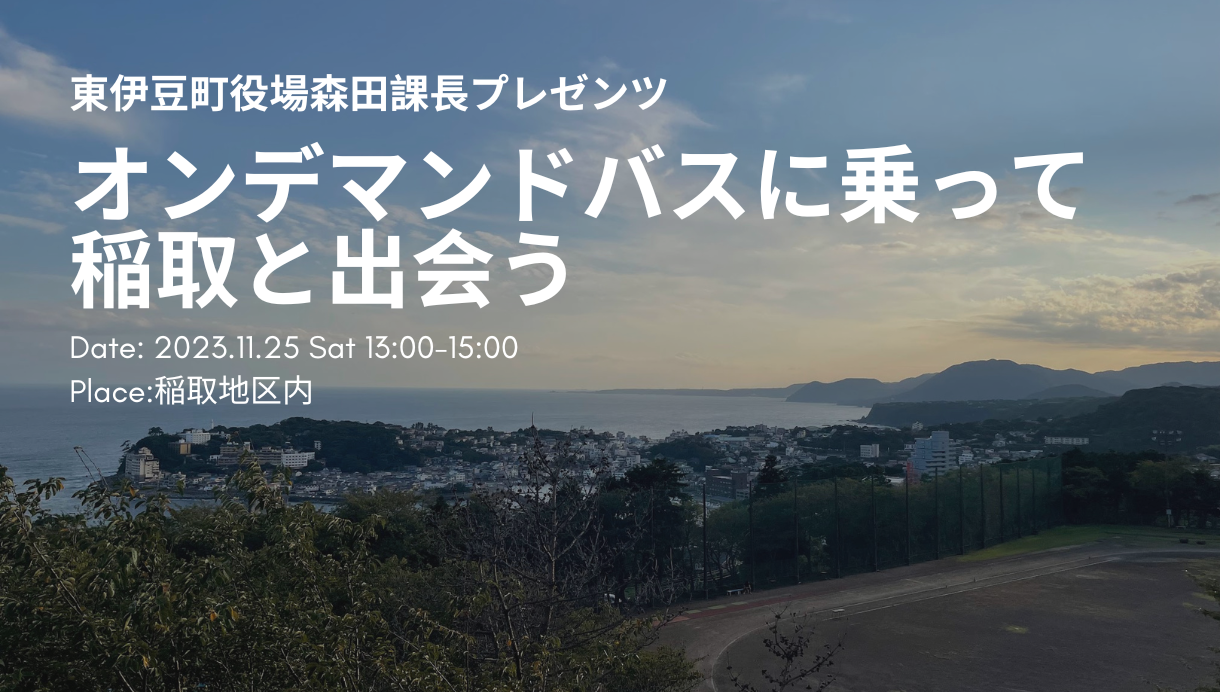 ★11月25日〜11月27日間の3日間、東伊豆町でまちづくりコーディネーターとして活動する合同会社うさぎ企画との連携企画として、「食」を通じて地域内外の人々がが出会い、交流する8つのプログラムを東伊豆町稲取地区にて実施します。普段はなかなか出会うことのない、異なる価値観を持った人たちが食を通じて出会い、交流する中で、稲取が持つ魅力を地域外から来た人にも地元に暮らしている人にも再発見していただくと同時に、稲取が抱えている課題を可能性に変える共創が始まるきっかけとして実施しますので、地方とのつながりや美味しい食に興味ある方はぜひご参加ください。◉プログラム1「東伊豆町役場森田課長プレゼンツ・オンデマンドバスに乗って稲取と出会う」伊豆町出身・東伊豆町育ちで、現在は東伊豆町と他の地域をつなぐコーディネーターとして活躍される東伊豆町役場・企画調整課課長の森田さんと共に、期間限定で走るオンデマンドバスに乗って稲取地区を巡ります。定番の観光地も地元の方と回るだけで全く違う魅力が見えたり、新しい出会いが生まれるかもしれません。ただ観光で巡るのとはひと味違う体験をお楽しみください。◉開催概要・開催日時:11/25(土)13:00~15:00頃・集合場所:INAZUMA_SUTTLE10「こらっしぇ・役場前」(プログラム中の移動には、オンデマンドバス「INAZUMA_SHUTTLE」を利用します。お申込みされる方は、事前にLINEアカウントを友達追加し、1日乗り放題チケット(600円)をご購入ください。詳しくはこちらをご覧ください(https://inazuma-shuttle.com))・ご協力いただく地元の方:東伊豆町役場企画調整課課長・森田さん・所要時間:2時間程度・定員:5名程度・参加料金:500円◉注意事項・本体験は現地集合・現地解散となります。・本企画は、合同会社うさぎ企画が進める経済産業省・広域人材交流事業の一環で行なっており、事務局としてSlow Neighborhood(合同会社MENDI/合同会社CICLO)がプログラムの企画・運営を担っております。事業詳細はこちらをご覧ください(https://www.slow-neighborhood.com/higashiizumachi-movinground)