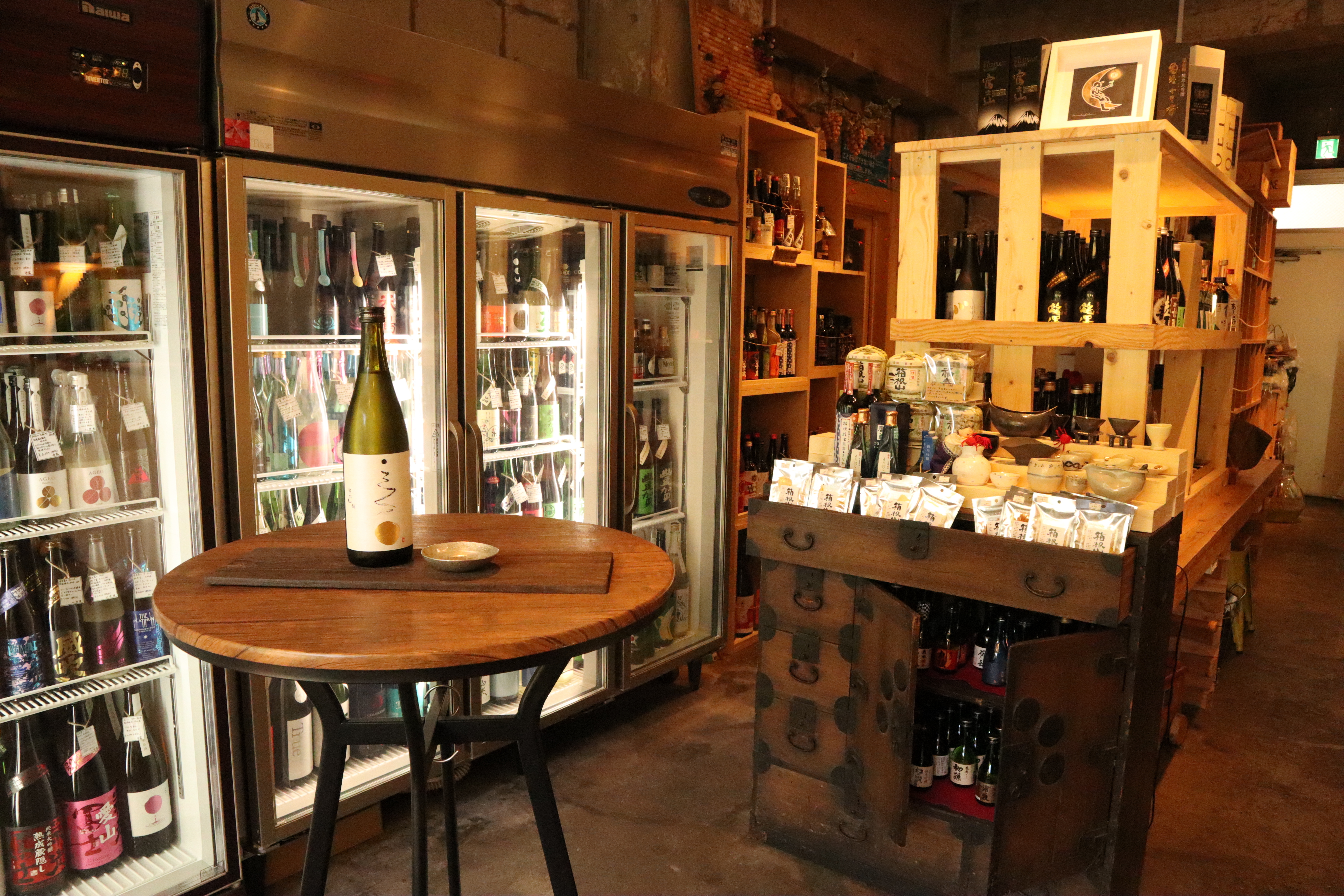 種類豊富なお酒の瓶に囲まれながら、工芸のおちょこで3種類の日本酒を飲み比べしていただけます。