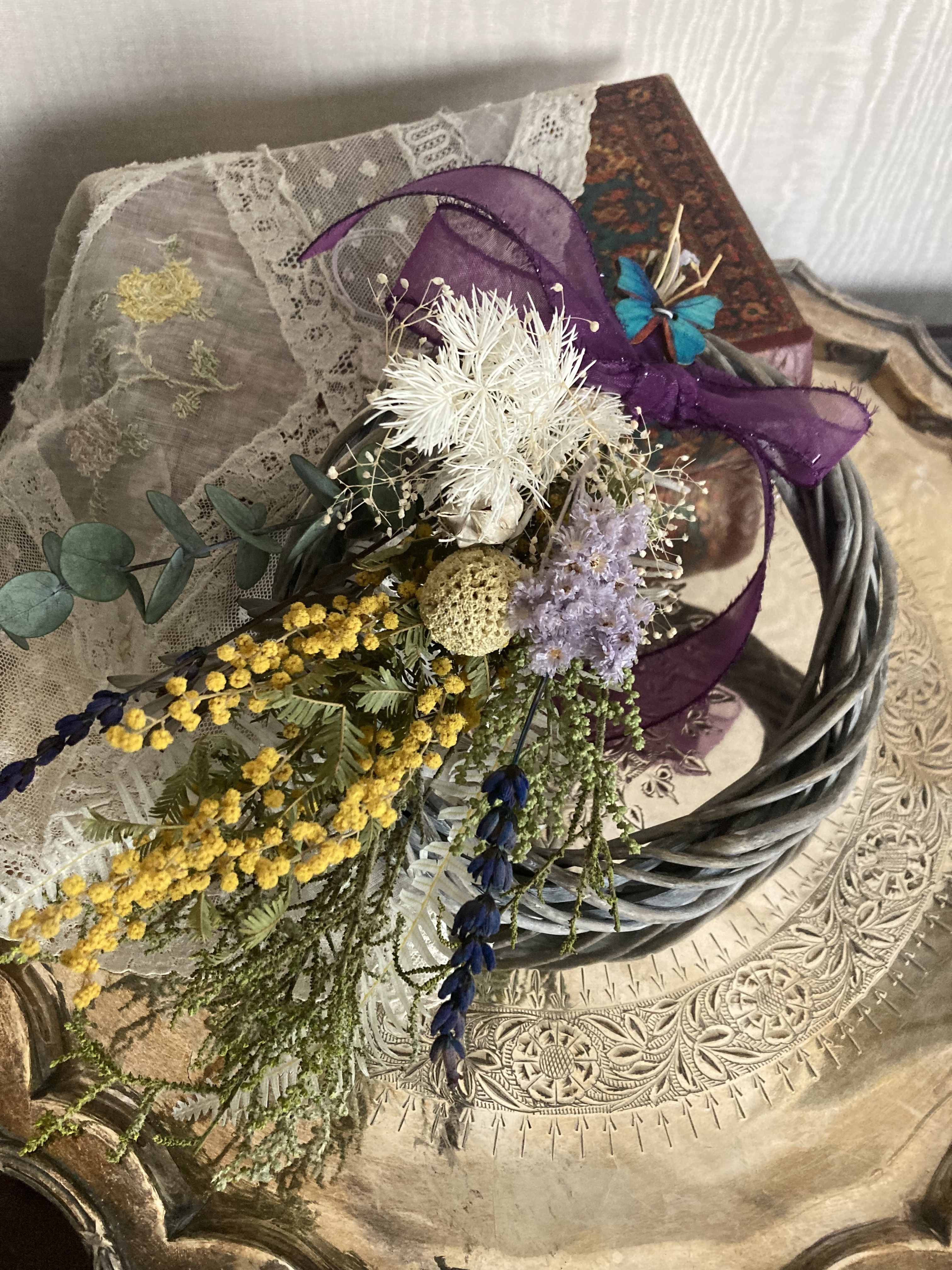プリザーブドフラワーのミモザ、濃い黄色のカスミ草、白のヤマシダ