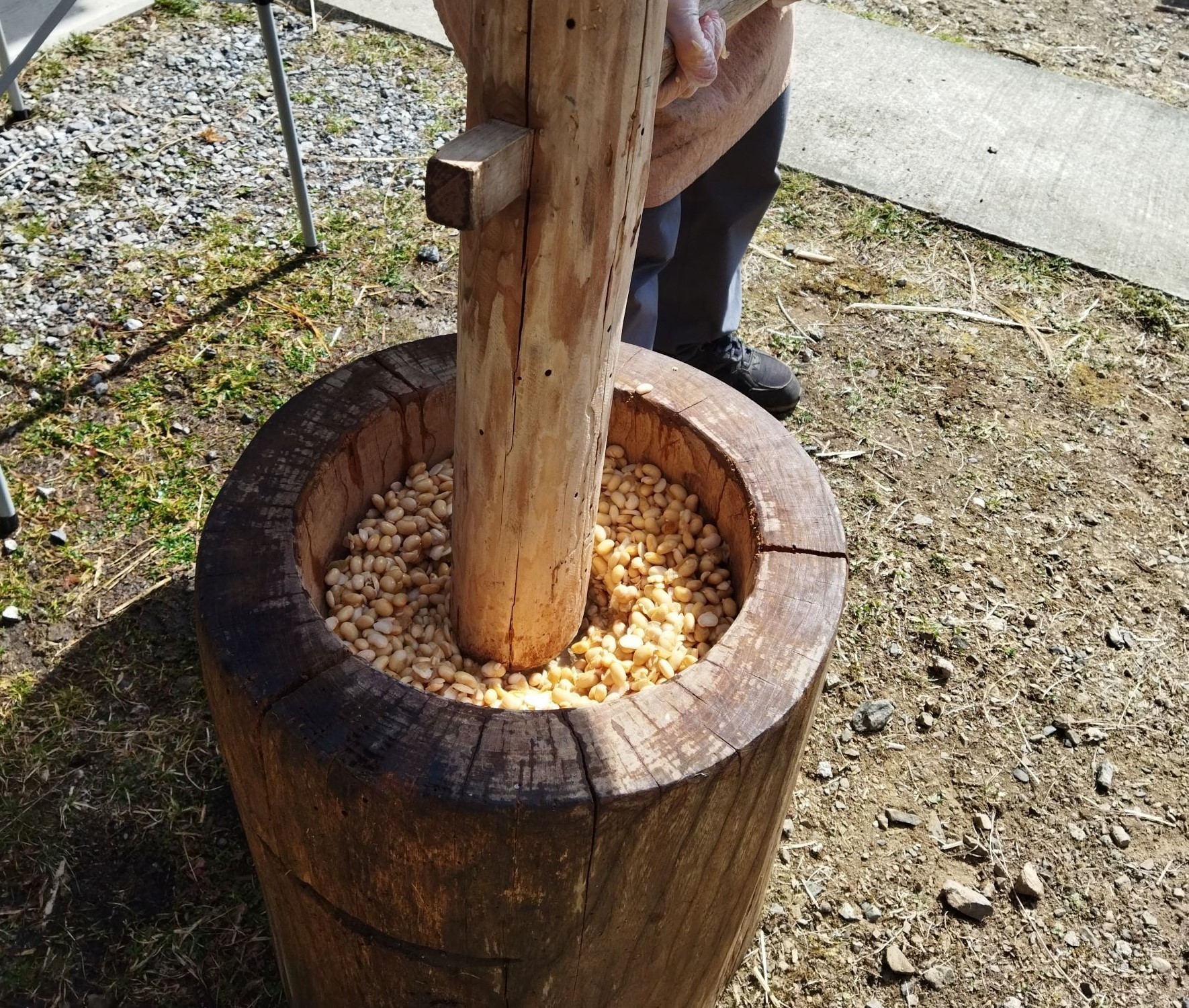 11:10 味噌作りスタート 薪で茹でた大豆を杵と臼でつぶします。