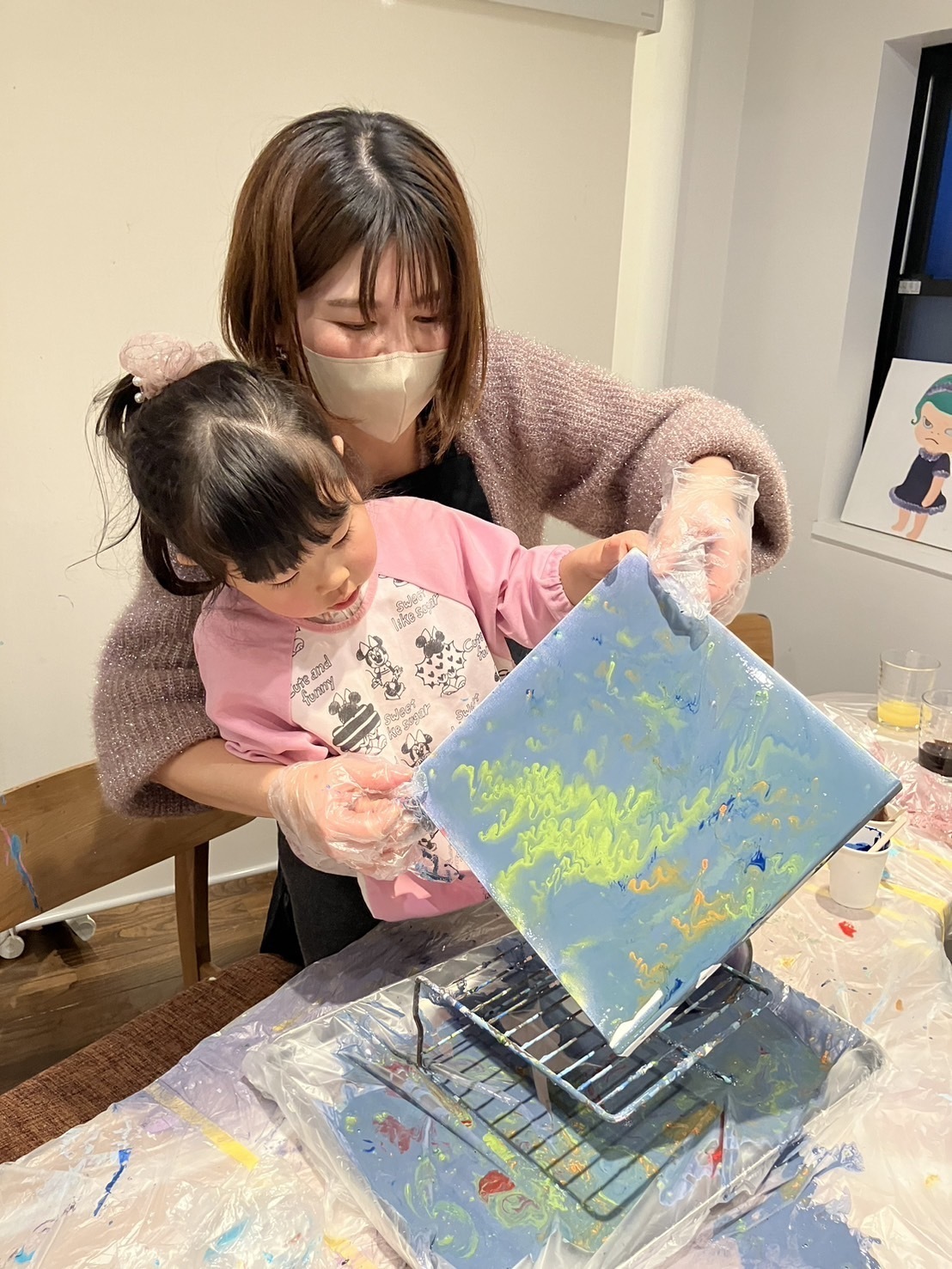 アートアンドカフェでは、通常のたらし込み(フルイドアート、流し込みアート、ポーリングアート)以外にも、金箔やキラキラなどもご用意しております。出来上がった作品は、リビング、寝室、エントランスなどのインテリアを上質にします。東京の観光ついでにも人気があります。