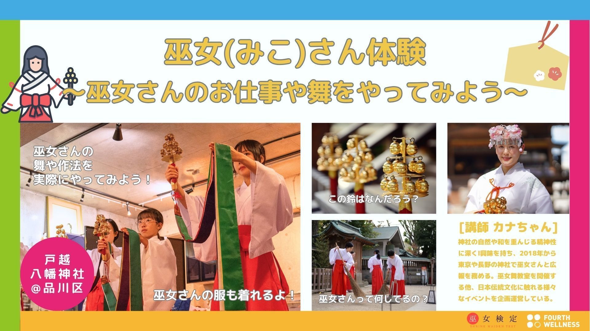 ・巫女舞体験: 伝統的な巫女舞「浦安の舞」の体験を行います。美しい舞の所作には日本文化の教養が詰まっています。