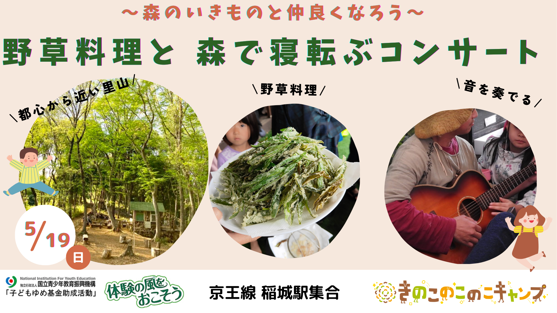 2024年5月企画は「野草料理と森に寝転ぶコンサート~森の生き物と仲良くなろう~」です。