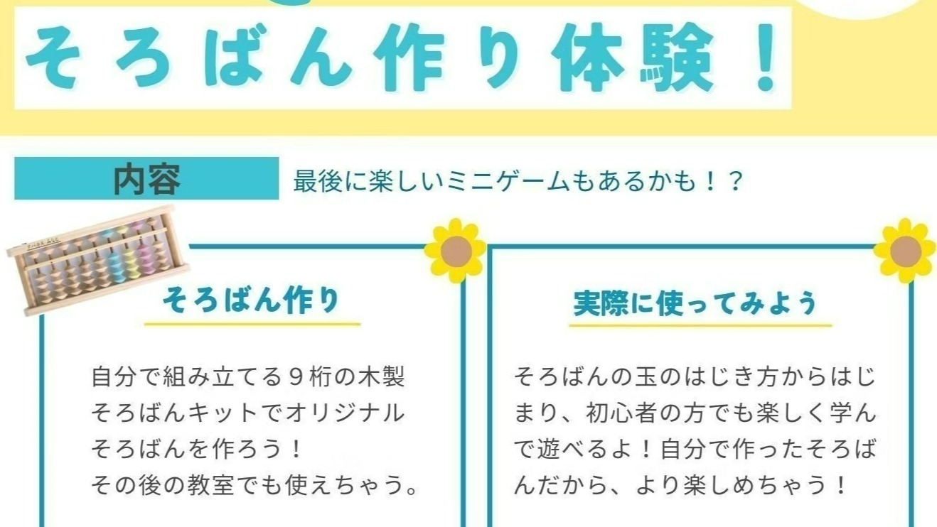 ☆そろばん作り→自分で組み立てる9桁の木製そろばんキットでオリジナルそろばんを作ろう!その後の教室でも使えちゃう。☆実際に使ってみよう→そろばんの玉のはじき方からはじまり、初心者の方でも楽しく学んで遊べるよ!自分で作ったそろばんだから、より楽しめちゃう!