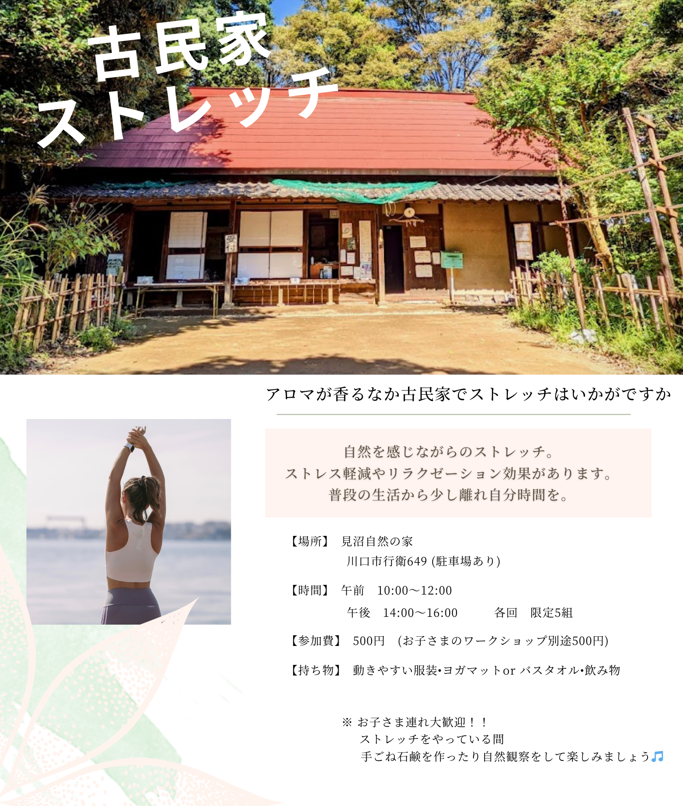 古民家でストレッチをしませんか。【日時】8月25日(日)【場所】見沼自然の家 川口市行衛649 (駐車場あり)【時間】①10:00〜12:00 ②14:00〜16:00【参加費】500円 (お子さまのワークショップ別途500円)【持ち物】動きやすい服装、飲み物 ヨガマット or バスタオル※ お子様連れ大歓迎!!ストレッチを行ってる間、手ごね石鹸を作ったり、自然観察をして楽しみましょう🎵