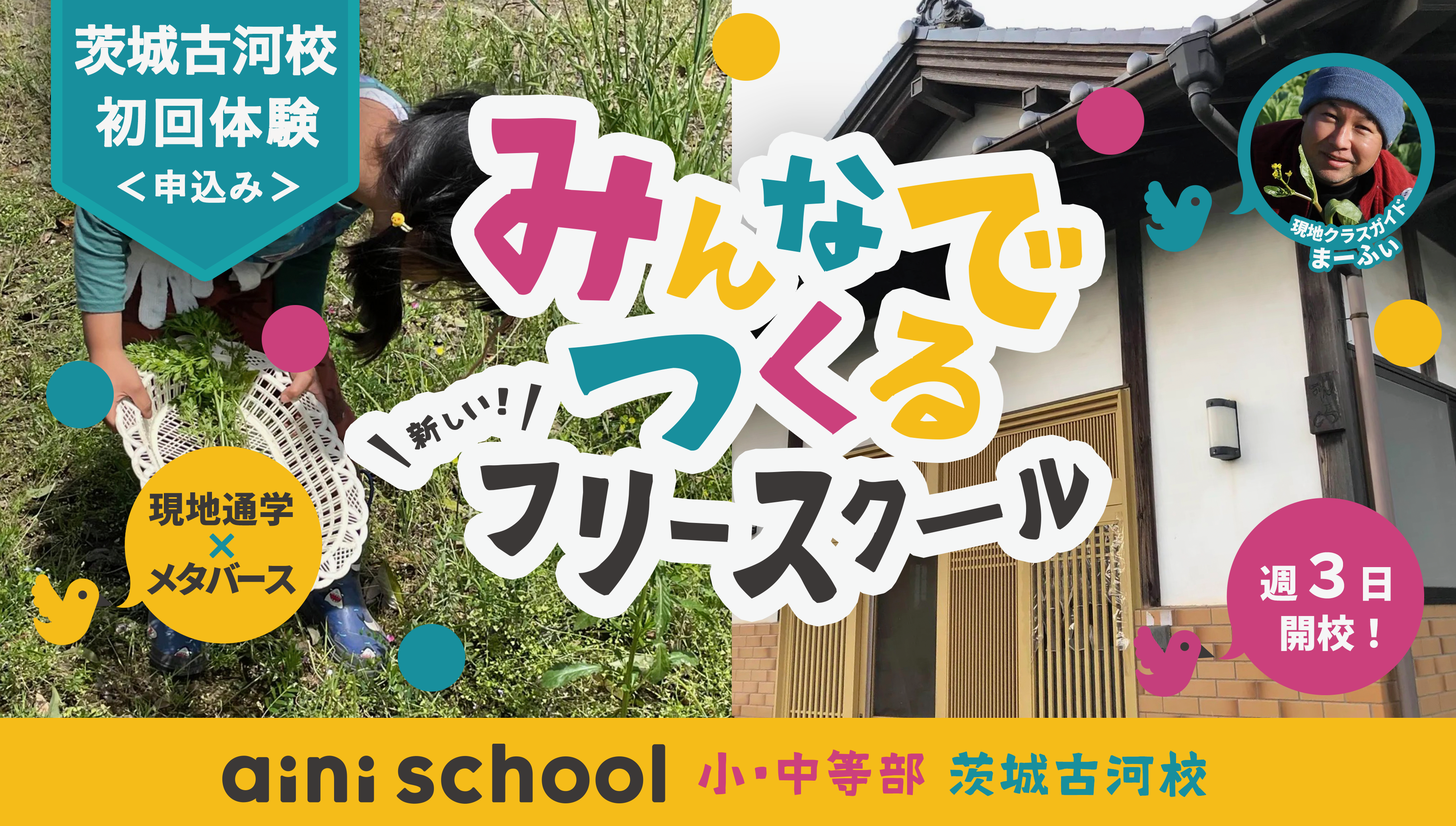 こちらのページはオンラインオルタナティブスクール(フリースクール)aini school小中等部(https://helloaini.com/entry/featuring/aini-freeschool/)の通学用校舎 茨城古河校の【初回】体験参加申し込みページになります。〜〜〜〜〜〜〜〜〜〜〜〜〜aini school 小中等部 茨城古河校は「フリー!フラット!オープン!」を大切にした、遊んで学べるオルタナティブスクール(フリースクール)。子ども1人1人の個性や自由な選択が尊重され、ありのままの自分でいいと感じられる、第三の居場所。周りは畑に囲まれ自然豊かな環境で大切な時間を過ごせます。天気がいい日はみんなで畑で種をまいたり、野菜を収穫したり。収穫した野菜でみんなでお昼ご飯を作ったり。自然がいっぱいの本校では、色んな虫たちや草たちにも出会えます。メタバース校との併用で、学校に行く日も、行かない日も、どこにいても、一瞬で社会とつながる!学べる!会える!みんなでつくる子どもが主役の新しい時代の学校です。◆ 開校日時:火曜日、水曜日、木曜日 10:00-15:30◆初回体験参加対象:小学生、中学生※初回体験は1回のみとなります。※aini school生徒ではない方で、体験後に入学希望の場合、aini schoolへの入学が必要となります。◆ 初回体験参加費:3000円(食費&材料費込み)※正規入学後の料金はこちらでご確認くださいhttps://helloaini.com/entry/featuring/aini-freeschool/【基本スタッフ】まーふぃ(火〜木 担当):https://helloaini.com/users/37674しーちゃん(不定期 担当)※スタッフは参加生徒の人数に応じます (生徒5人まではスタッフ1〜2人、生徒6人以上はスタッフ2〜3人)※日によって、担当スタッフが変更になる可能性があります◆ 場所: 茨城県結城市東茂呂214 aini school 茨城古河校https://maps.app.goo.gl/jywZwsNeVFzjukQV7 (JR東北本線・宇都宮線 古河駅もしくは野木駅から車で20分ほど)◆ 1日の基本スケジュール例10:00-10:15 登校&朝の会10:15-11:00 自由進度学習11:00-12:00 ごはんづくり12:00-13:00 ランチタイム・休憩13:00-13:15 チルタイム13:15-15:00 探求活動(植物・虫観察、外遊び、アート活動、ボードゲームなど)15:00-15:30 お片付け&帰りの会※子どもたちと一緒に話し合いながら過ごし方を決めていきます。※現地からaini schoholメタバース校の授業参加も可能◆ 持ち物:自由進度学習時間に学びたい教材、任意でノートPC(aini schoolオンライン授業に参加する人)、他自分が持ってきたいものなど(迷っている場合は相談してください。一緒に考えましょう☺️)◆初回体験後の入学の流れ1)体験後 → 体験終了後、入学希望の方は入学申込みを行ってください。2)入学申込み → 入学申込み(https://share.hsforms.com/1NSs2MOylT42PmB7z7a6WlAe8zrq)をいただいた後、詳細な手続きをご案内します。3)入学 → 入学手続きが完了次第、正式にご入学となります。※ 生徒が5名集まり次第、開校スタートとなります。※ オンラインのaini school 小・中等部に入学された生徒が通学対象となります。※ 生徒数やスタッフの配置、現地の状況により、入学が難しくなる場合もありますので、ご了承ください。【ご注意・ご協力のお願い】必ずお読みください!※日々の活動の様子をスタッフが写真(動画)撮影する機会があります。スタッフが撮影した写真(動画)は、活動報告、HP、メディアの取材記事などで使用公開する場合がありますのであらかじめご了承願います。お子様と相談していただき、使用をご承諾いただけない場合や不安な点がある際は、ご連絡ください。配慮させていただきます。※保護者同伴の際は、活動のサポートをご協力よろしくお願いいたします(参加保護者の方は、写真撮影に関しては以下の内容を一読ください)▼その撮影/録画ちょっと待って!~オンライン参加ゲストの抱える不安https://helloaini.com/entry/host/4222/======================aini school 小・中等部とは▼詳細はこちら:https://helloaini.com/entry/featuring/aini-freeschool/======================aini school 小・中等部は随時入学説明会を開催中です♬ぜひお気軽にご参加ください。入学説明会申込:https://share.hsforms.com/11AHWKdFnTUep_7U_VgjKqAe8zrq今すぐに入会したい方はこちら!即入会申し込み:https://share.hsforms.com/1tjh7x2OaS2u9NPzmM_Y4QAe8zrq入会後、ご満足いただけなかった場合は返済もできますので、ご安心ください^^(入会後2週間以内のご連絡に限ります)