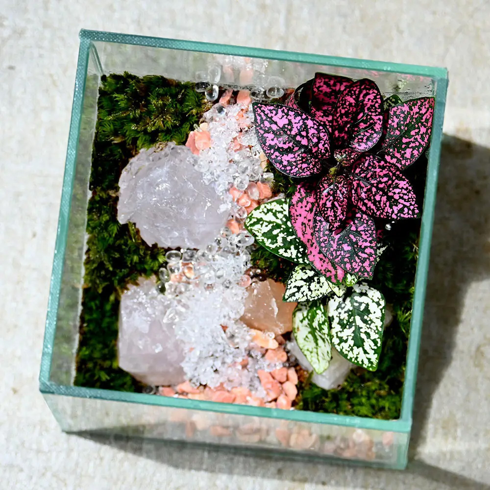 水晶、ローズクオーツ、アメジスト、フローライトなど、お好みの鉱石を選び、観賞性の高い宝箱のような苔テラリウムを製作します。