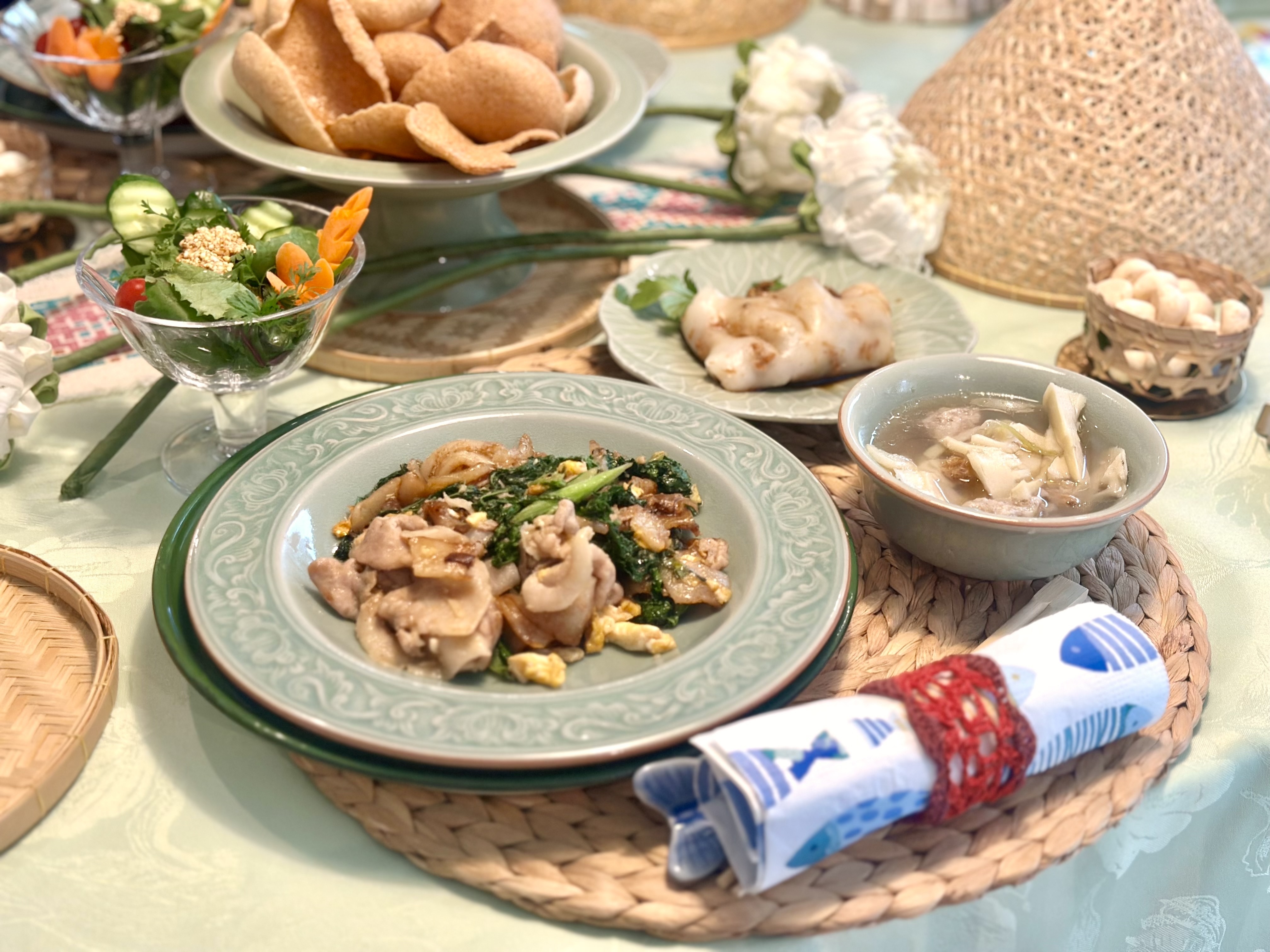 「クイッティアオ・ロート」は、切る前のセンヤイを使い、野菜や豆腐、シイタケなどを包み、蒸した麺料理です。