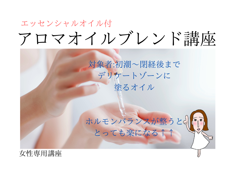 PMS対策、更年期対策、全年齢対象女性(フェミニンケア)に最適なブレンドオイルの作成までを楽しみます。