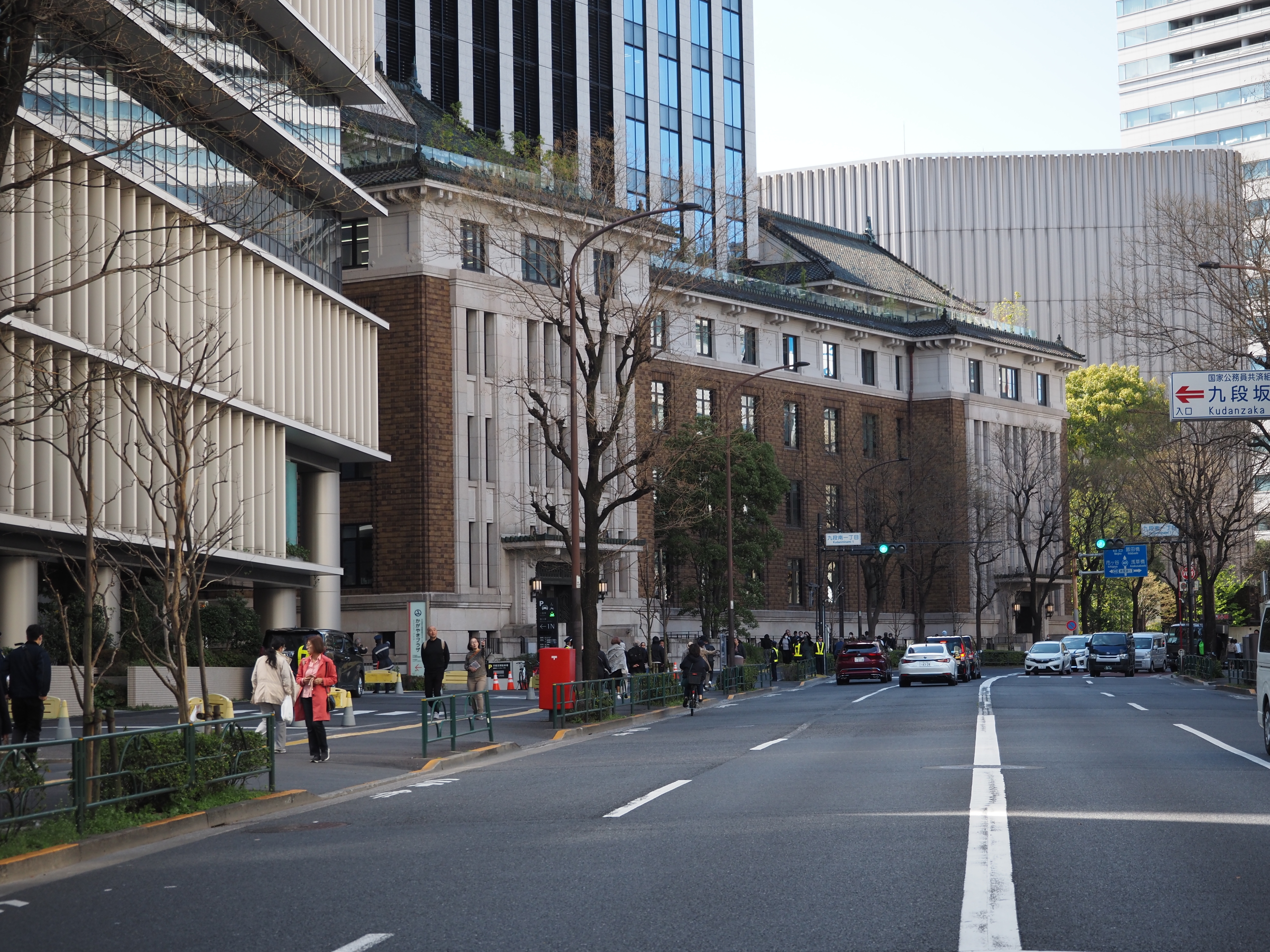 九段坂下交番目に集合!その後、九段会館テラス、牛ヶ淵、清水門、国立近代美術館と歩いてパレスサイドビルへ!一級建築士でもあるスリバチ会長が、建築の見どころをたっぷりと語ります。地形も面白いよ。