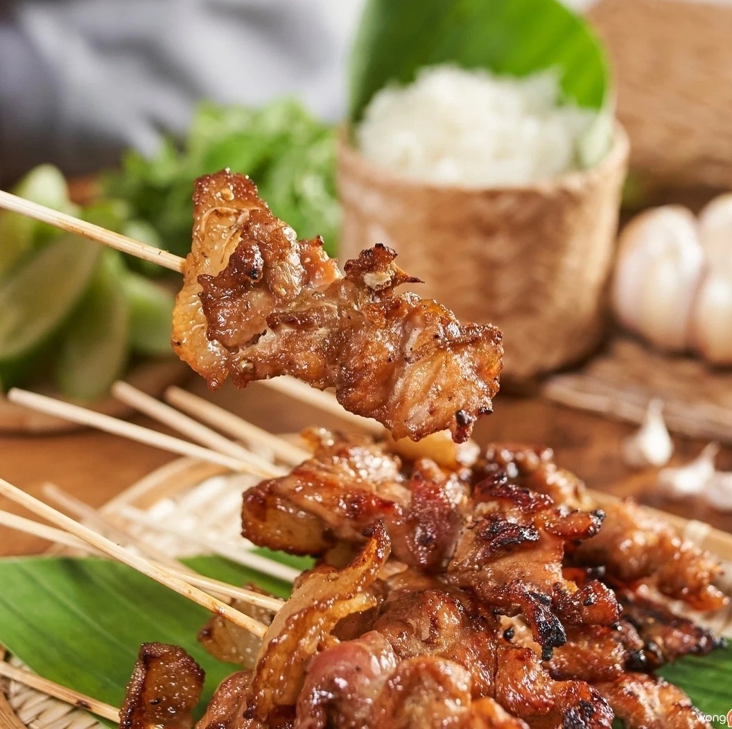 香ばしく焼き上げた甘辛味の豚串。タイもち米と一緒に食べれば、思わず笑顔に!