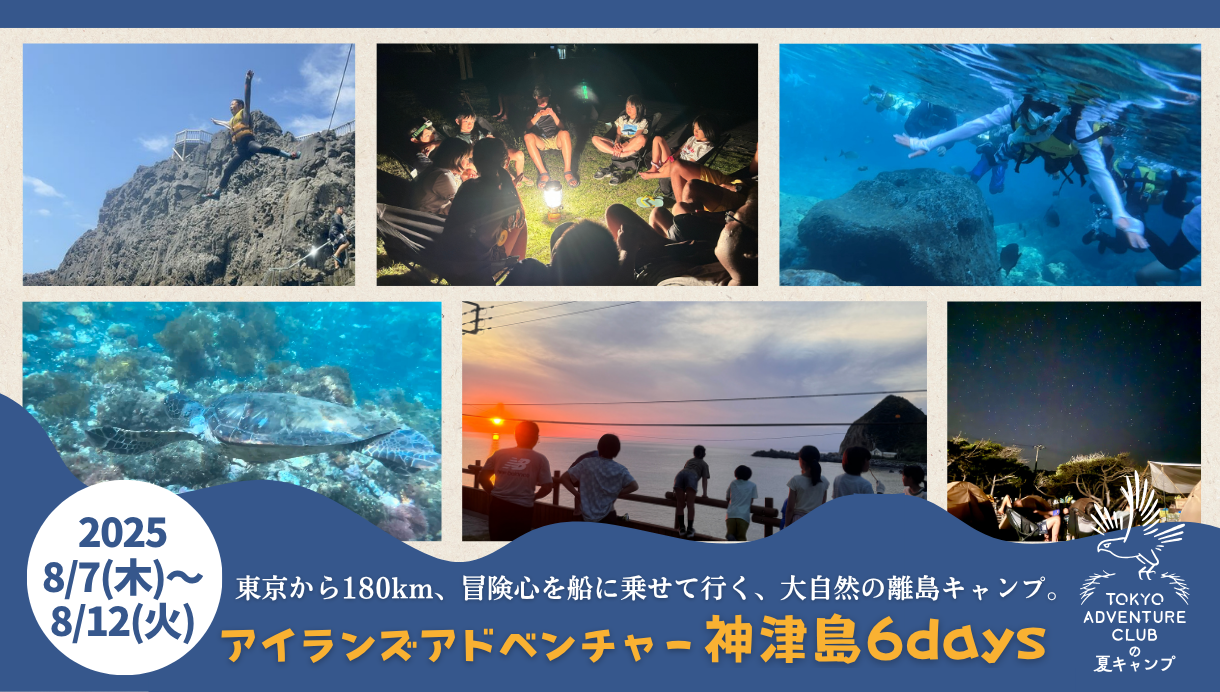 船に乗って目指すは神津島! 満天の星空、美しい海に美味しい海の幸、 さらに大自然・サバイバルを満喫したいキミのためのキャンプ。昨年好評だったアイランズアドベンチャー。神津島を4日間じゃ足りない!と子どもたち。今年は6日間にバージョンアップしました!