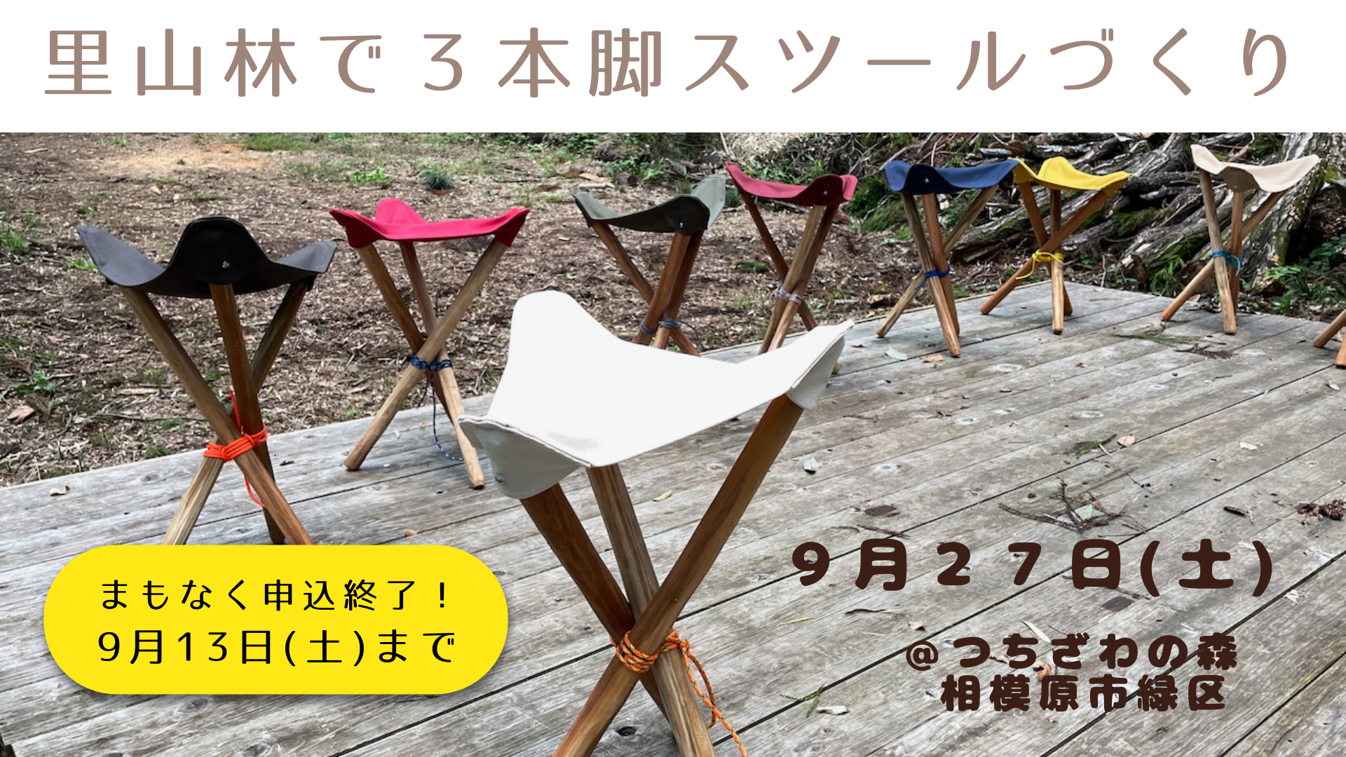 森で伐った樹から3本脚のスツールを作ります。木材を乾燥させずに加工するグリーンウッドワークの手法で、角材から丸棒を作り、パラコードで結びつけ、座面を取り付ければ完成です。座面の色は10色!津久井エリアに工房を構えるトートバック作家さんと開発した国産・倉敷帆布製です。