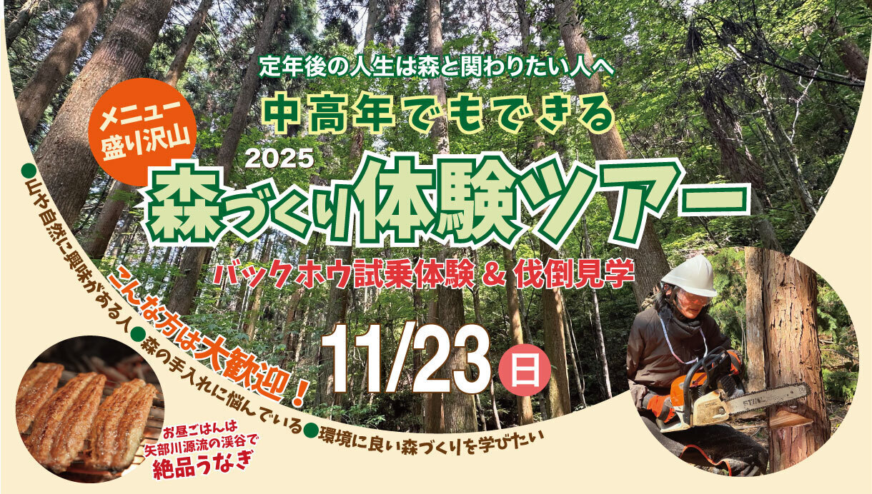 ・内容 体験ツアーの最後となる今回は、環境に良い森づくりで10年間手入れされた弥一の森で行います。バックホウに試乗&スギの伐倒を見学と森づくりの魅力満載の内容です。しかも昼食にはなんと特製「ひむか山道うなぎ」を堪能していただきます。森の中で食する秋のうなぎは脂も乗って美味しいですよ!