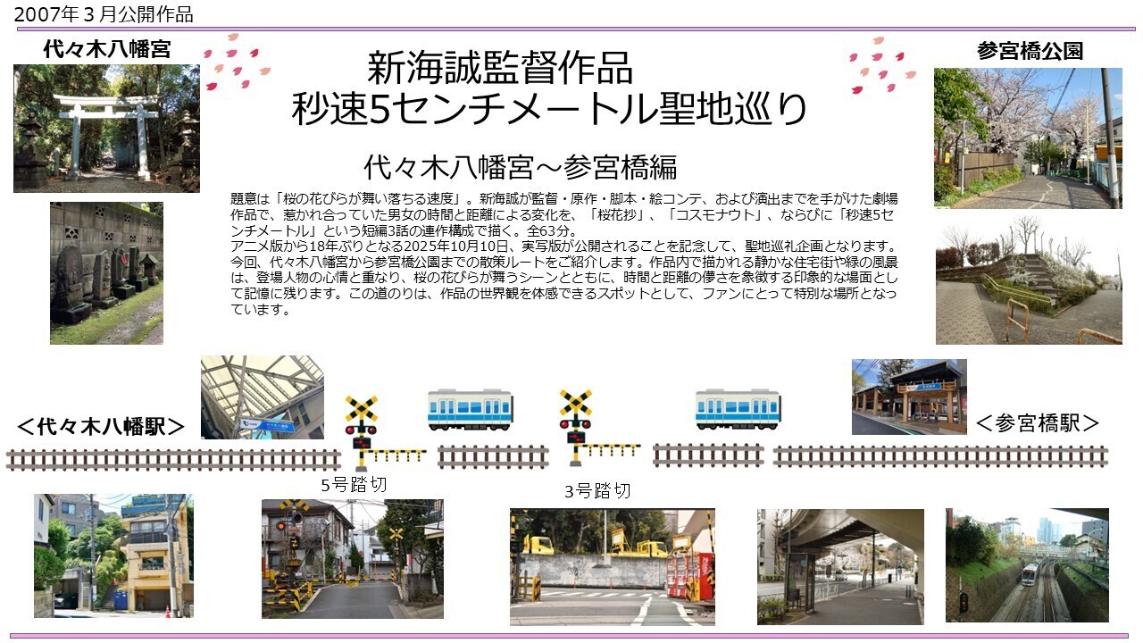 この散策コースは、アニメ『秒速5センチメートル』第1話「桜花抄」の舞台を中心に構成されており、