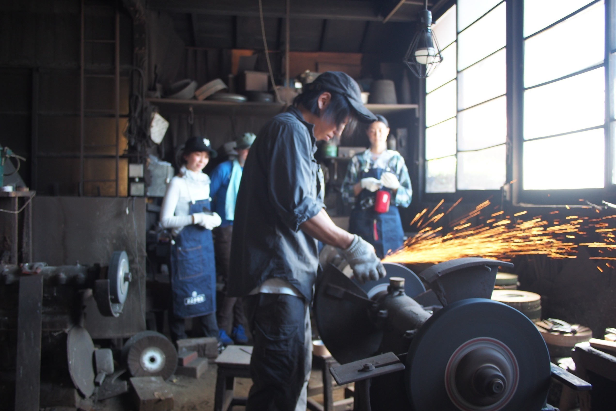 地元に残る鍛冶屋の工房にて、若き職人の指導のもと ”鉄を熱して、叩いて、冷まして、磨き上げる”