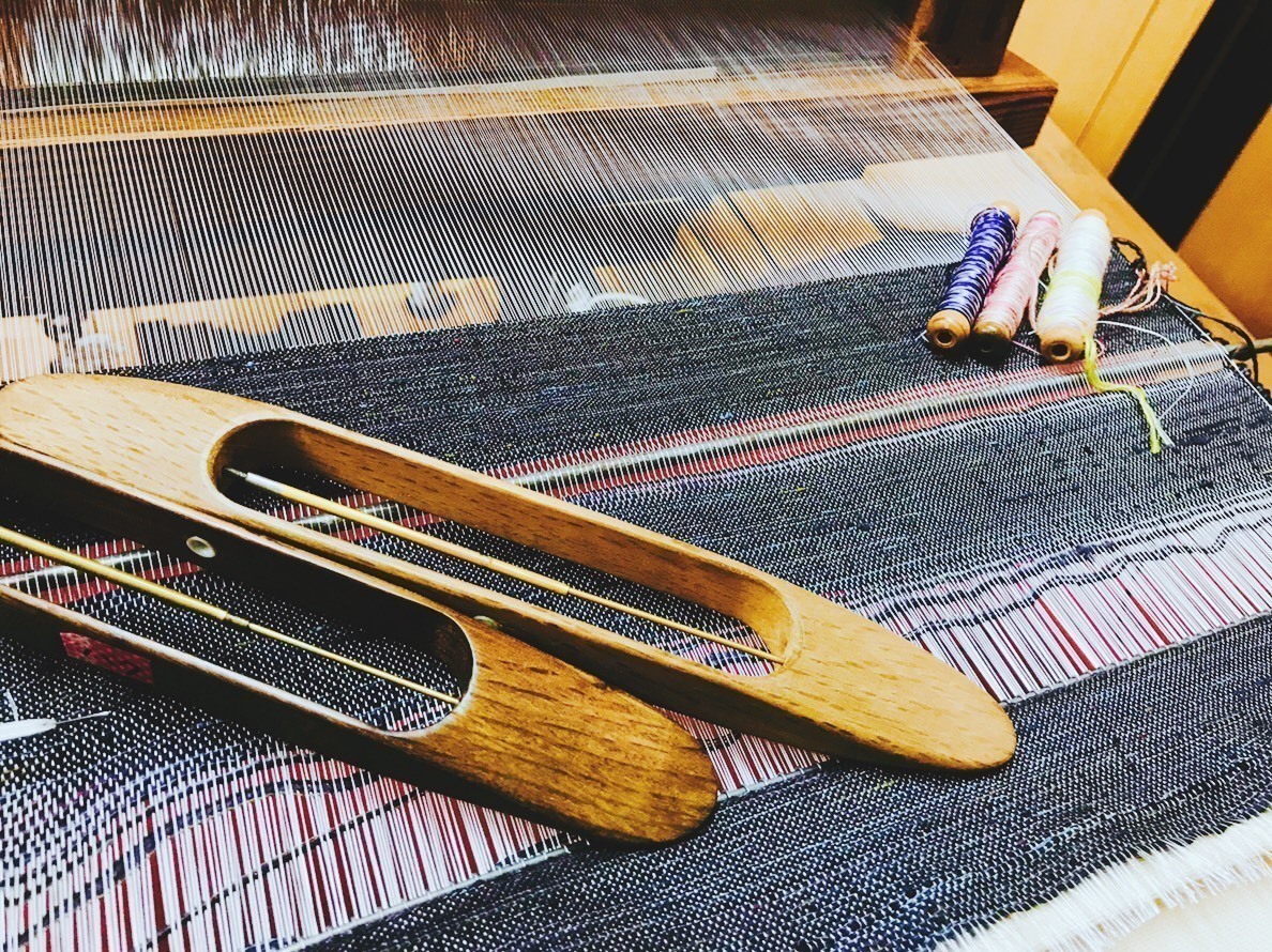 衣笠工房の2階に手で織る機織り機が5台あり、実際に糸を選び、生地を織って頂けます。