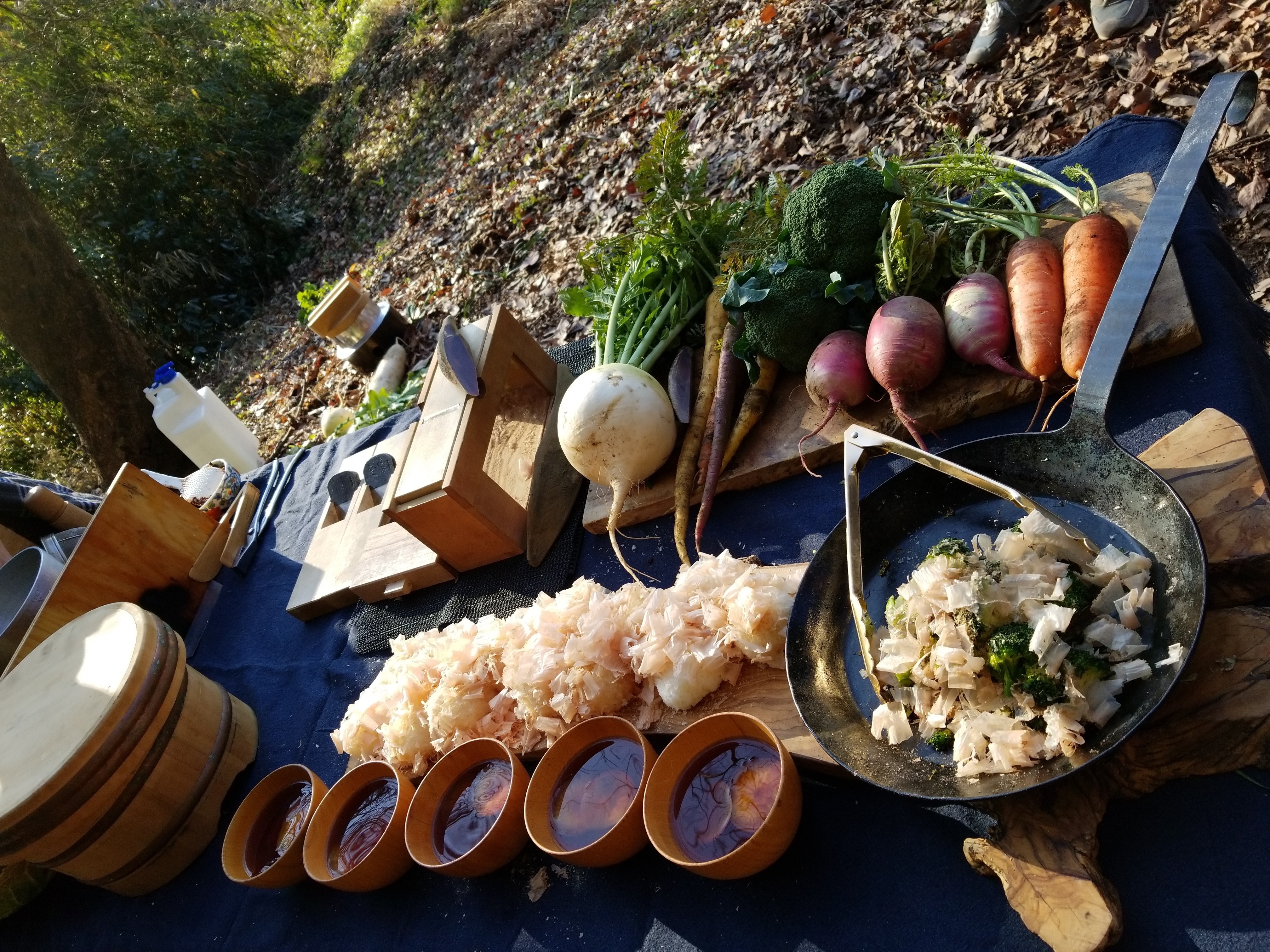 体験では、いのうえのうえんさんの畑で旬の野菜を自分たちで採り、かつお節の削り方を学びながら削り、出汁を引き、羽釜でお米を炊いて、みんなで一緒にいただきますをします。