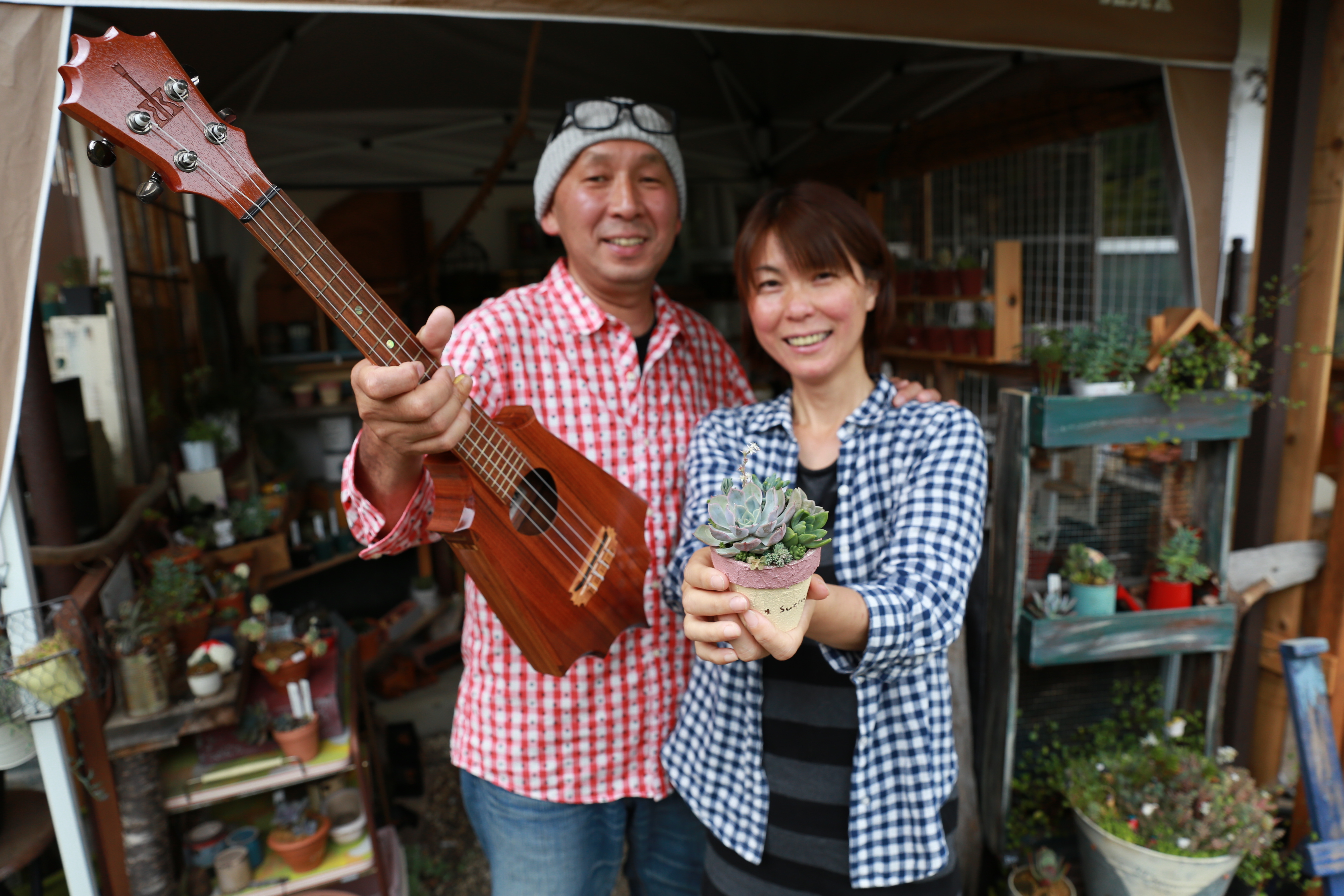 【ゲストへのご挨拶】自分達の趣味を生かして、古民家で自宅ショップをしています。 ゲストの皆さん、一緒に楽しくお喋りしながら、体験しましょう~🎵(^o^)/🔰初心者向けのレッスンなので…先ずはウクレレに触ってみて、簡単なコードを覚えて…ハッピーバースデーが弾けるまで~🎵植物に初めて触れる方でも一緒に楽しくお喋りしながら、多肉の寄せ植え体験出来ます~🎵(^o^)/