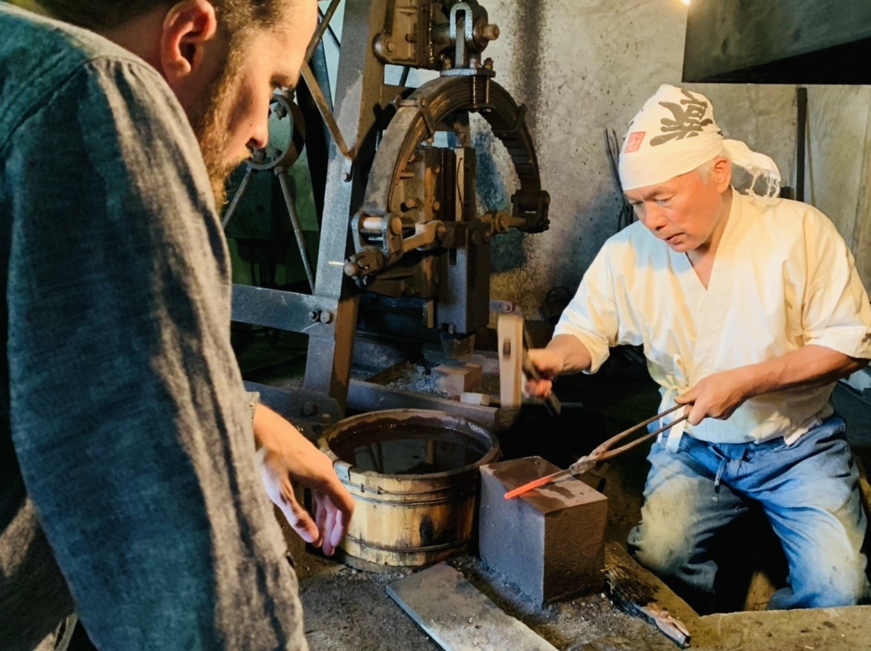 [午前中は、初めに刀鍛冶職人(刀匠)からご説明と琉球ナイフの素延べ(ナイフの形へ槌を使って延ばしていく)を行なっていただきます]